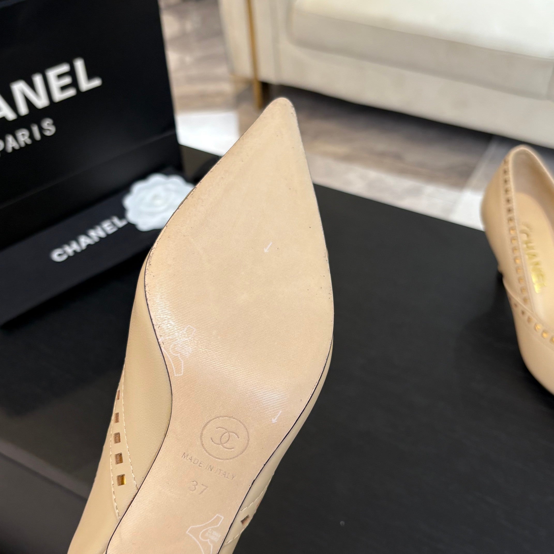 cc 25c slingback flat 15mm cross line pattern beige lambskin 237490