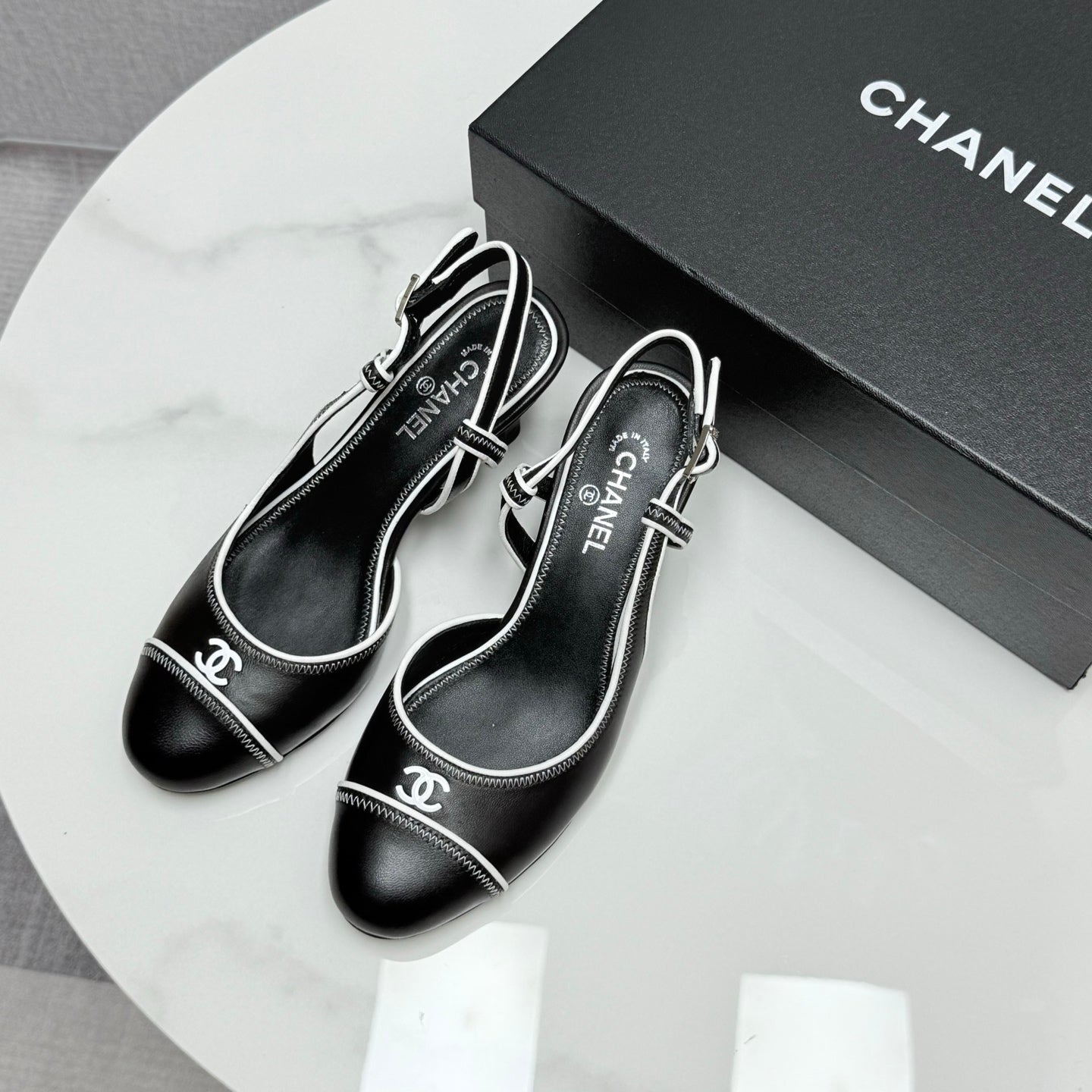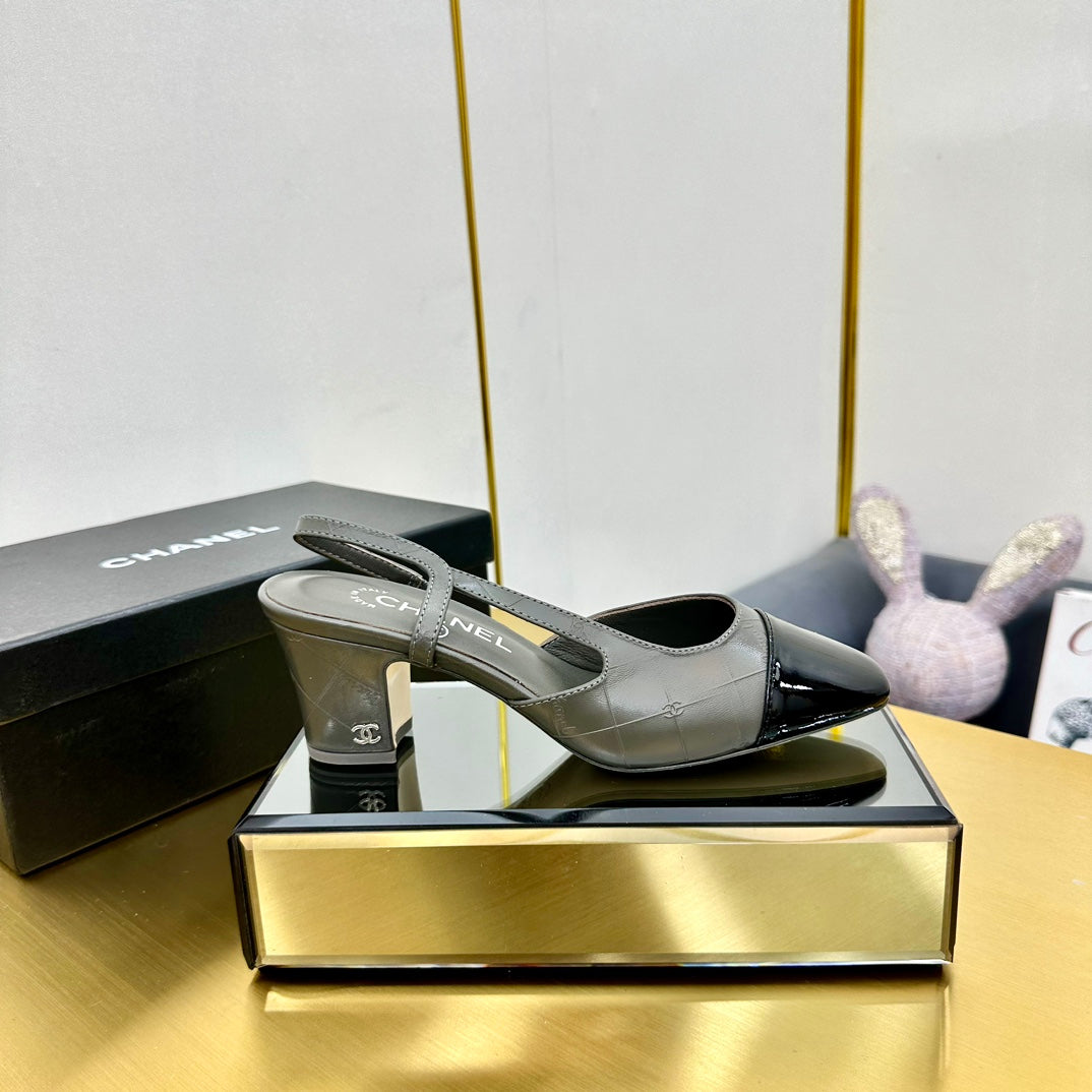 cc slingback pumps 65 in grey lambskin and black patent calfskin 137435