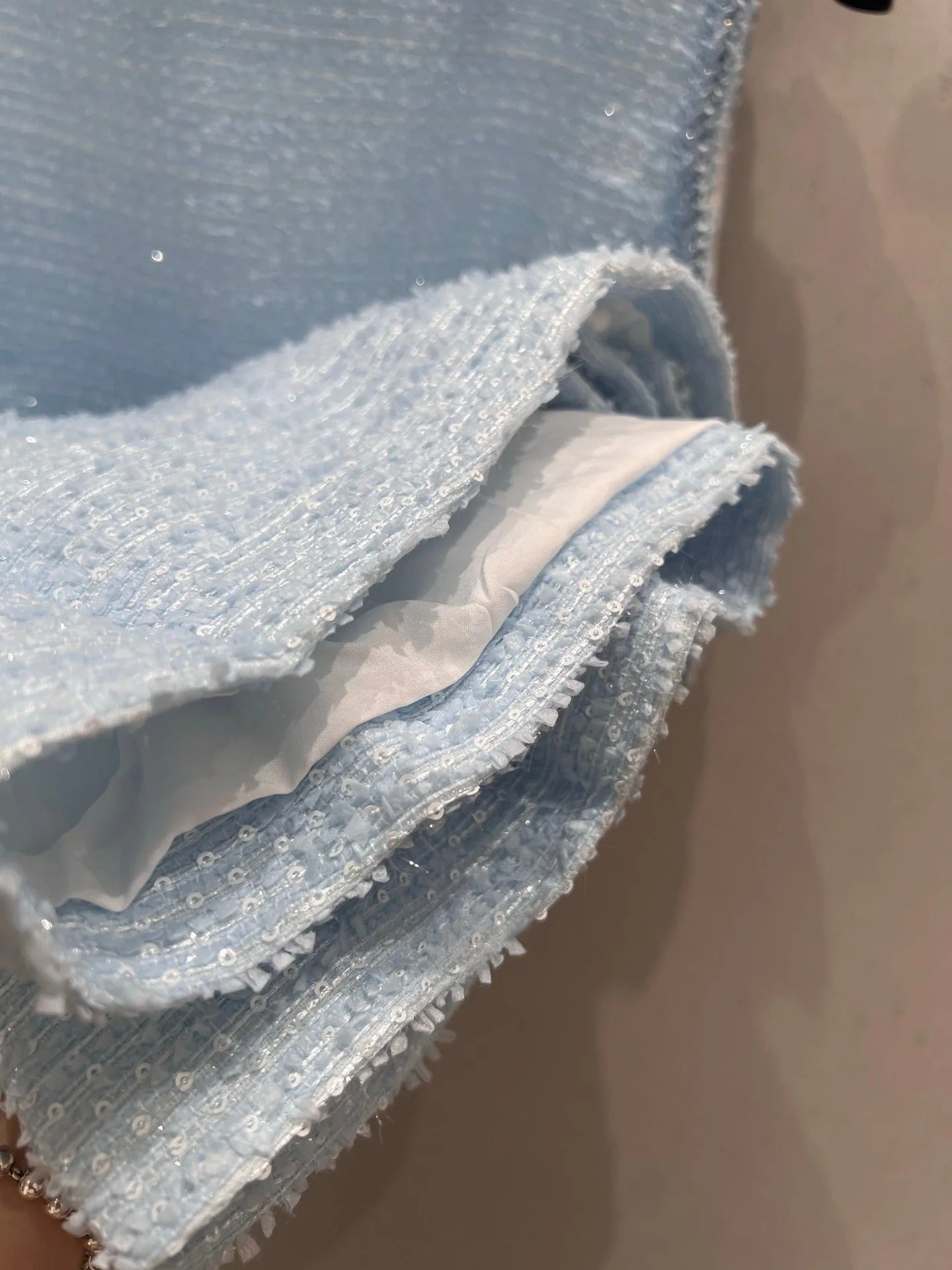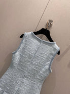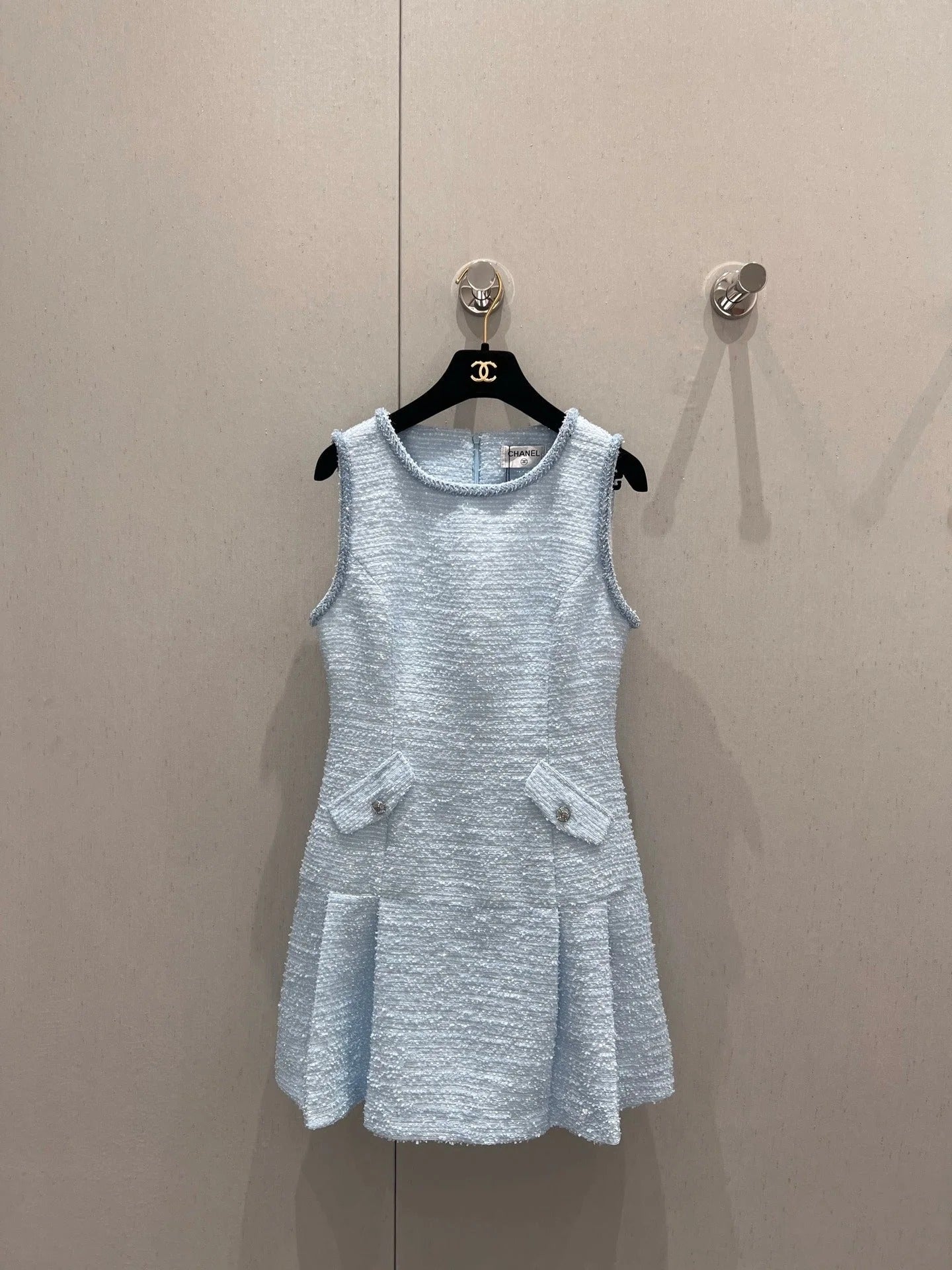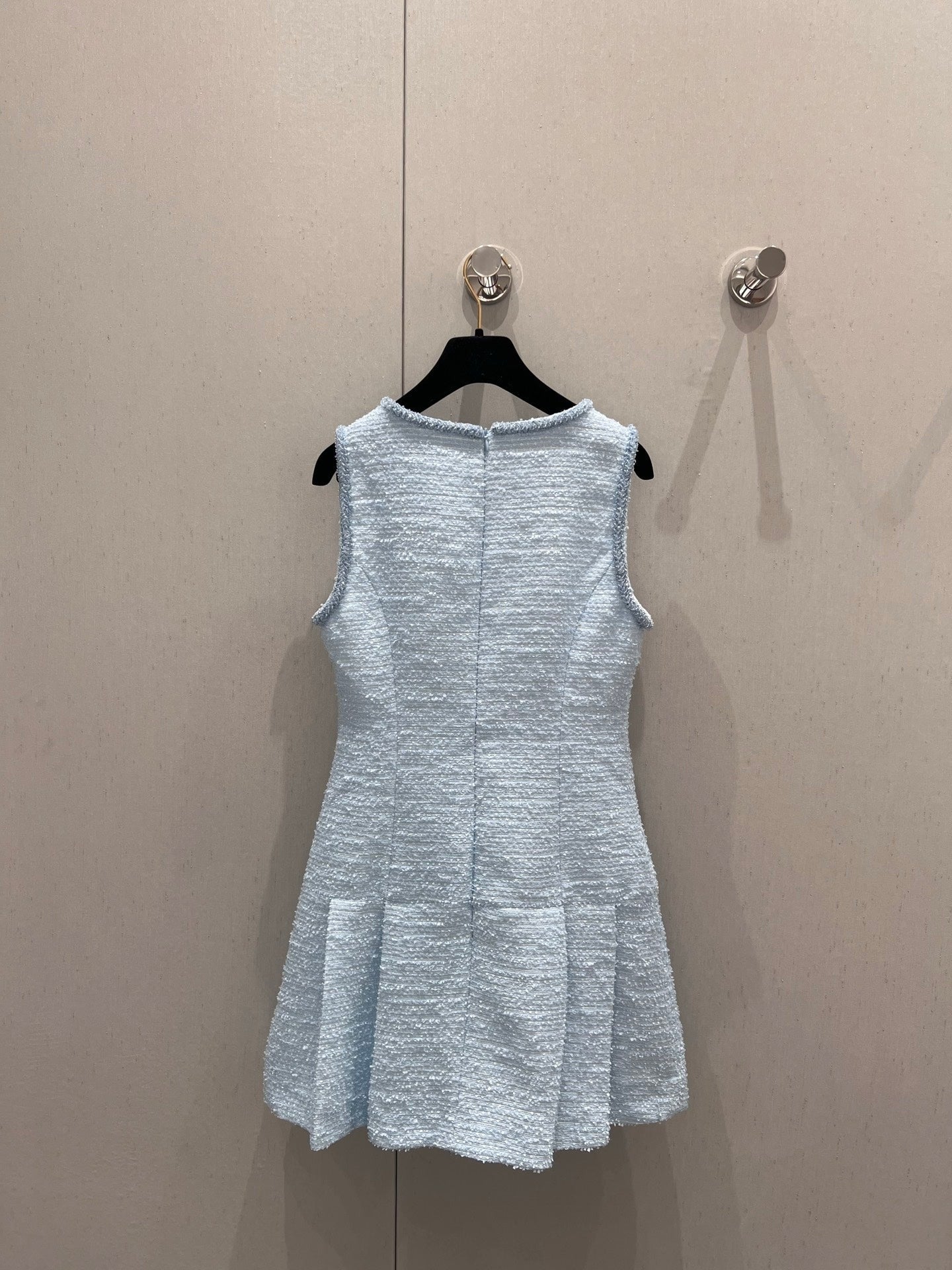 CHANEL SLEEVELESS TWEED BLAZER DRESS IN LIGHT BLUE