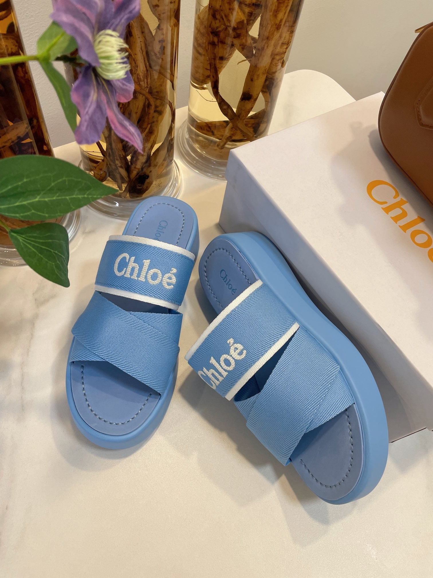 CHLOÉ WOODY WEDGE SANDALS IN CERULEAN BLUE CANVAS WITH RUBBER SOLE
