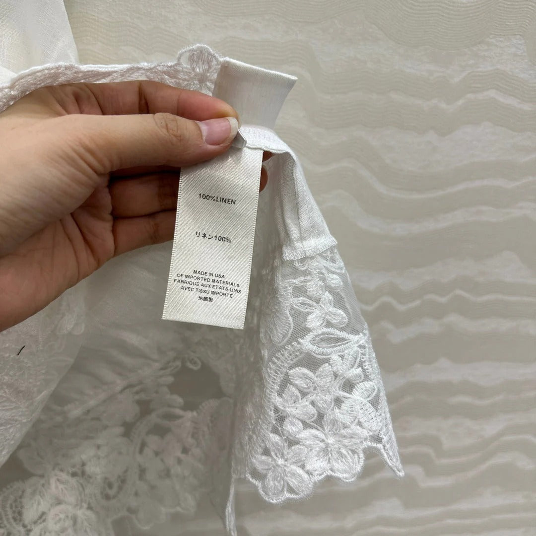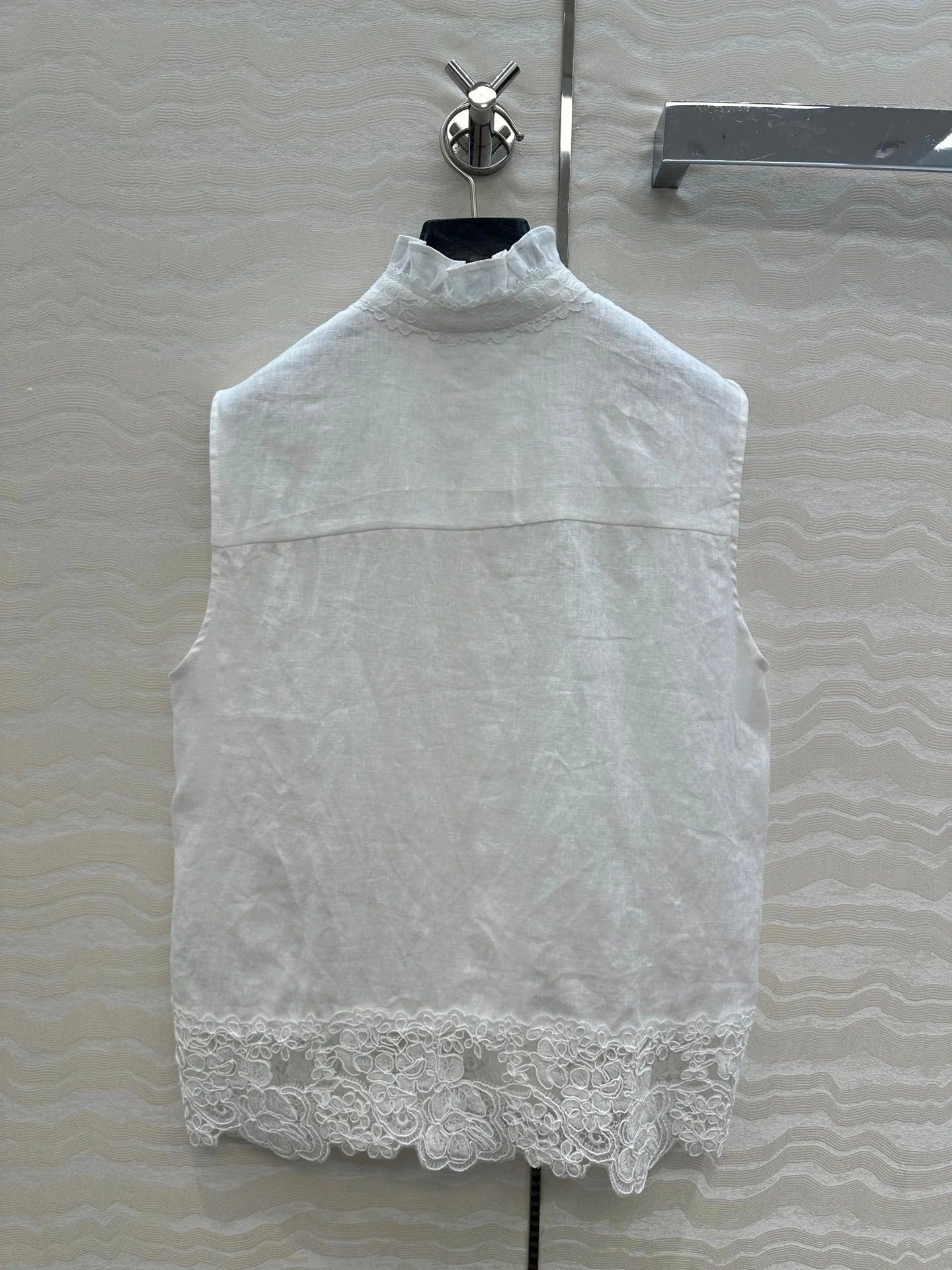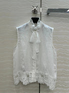 SLEEVELESS BLOUSE IN WHITE LINEN LACE TRIM AND NECK TIE