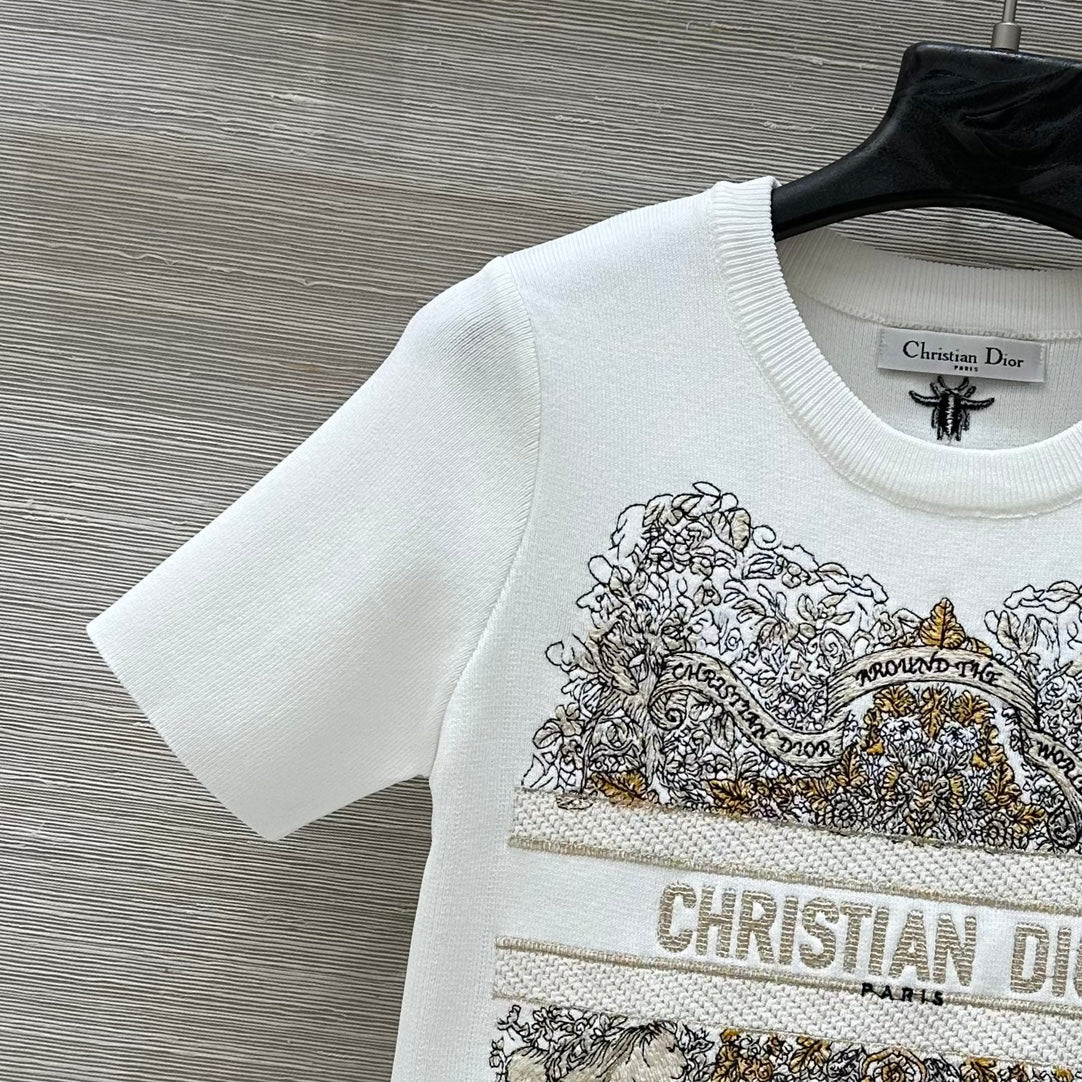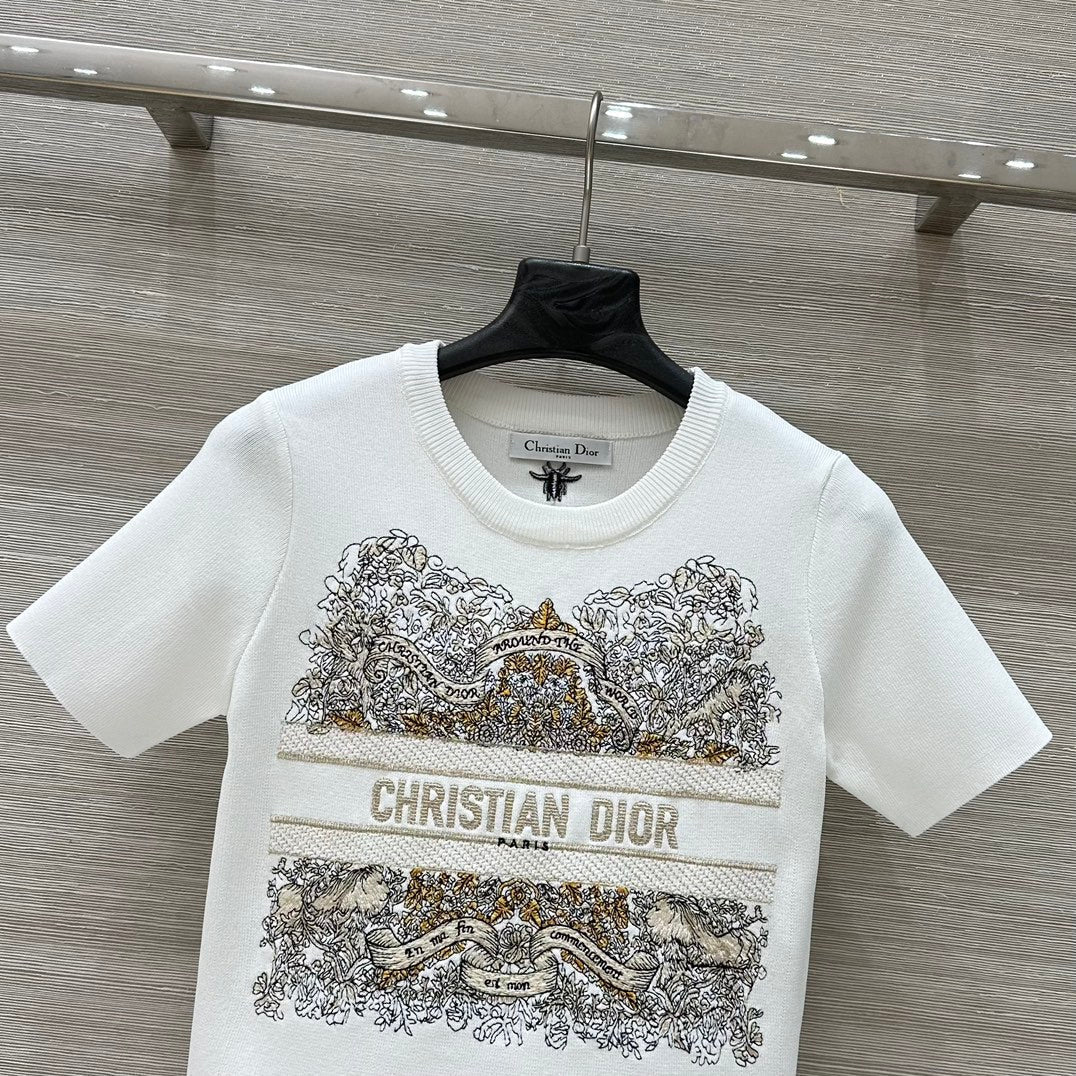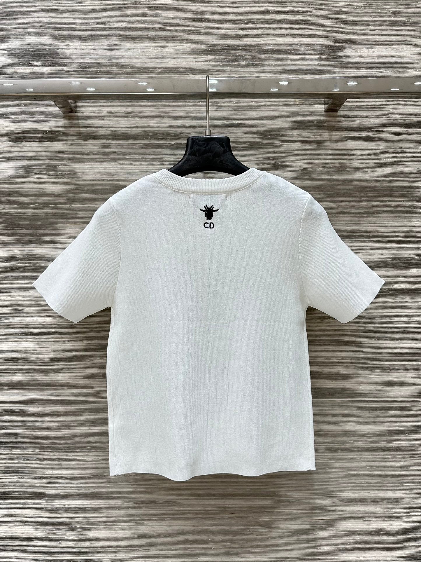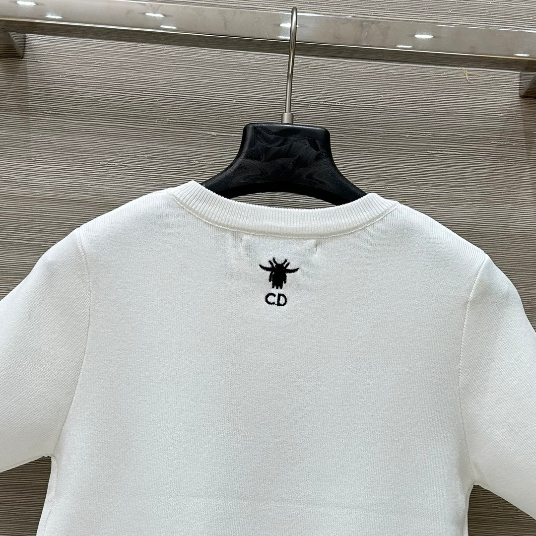 CD 25 Star Embroidery Knitted Short-sleeved Top White Tencel Wool