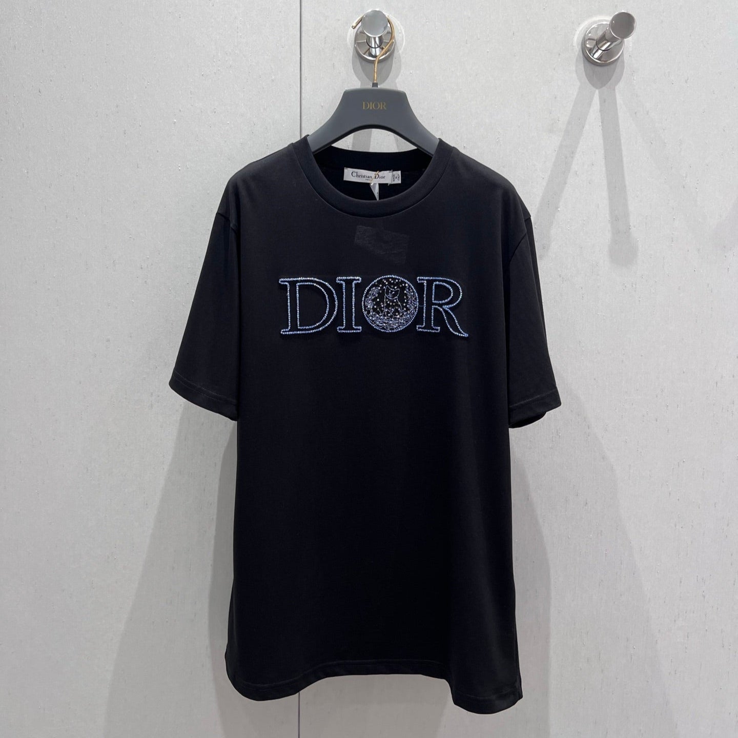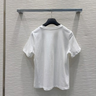 CD Rhinestone Embroidered Short-sleeved T-shirt Black and Beige Cotton