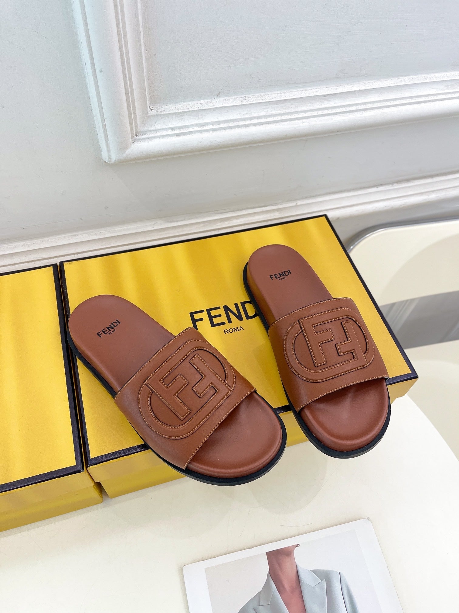FENDI LOGO SLIDES IN SYRUP BROWN CALFSKIN