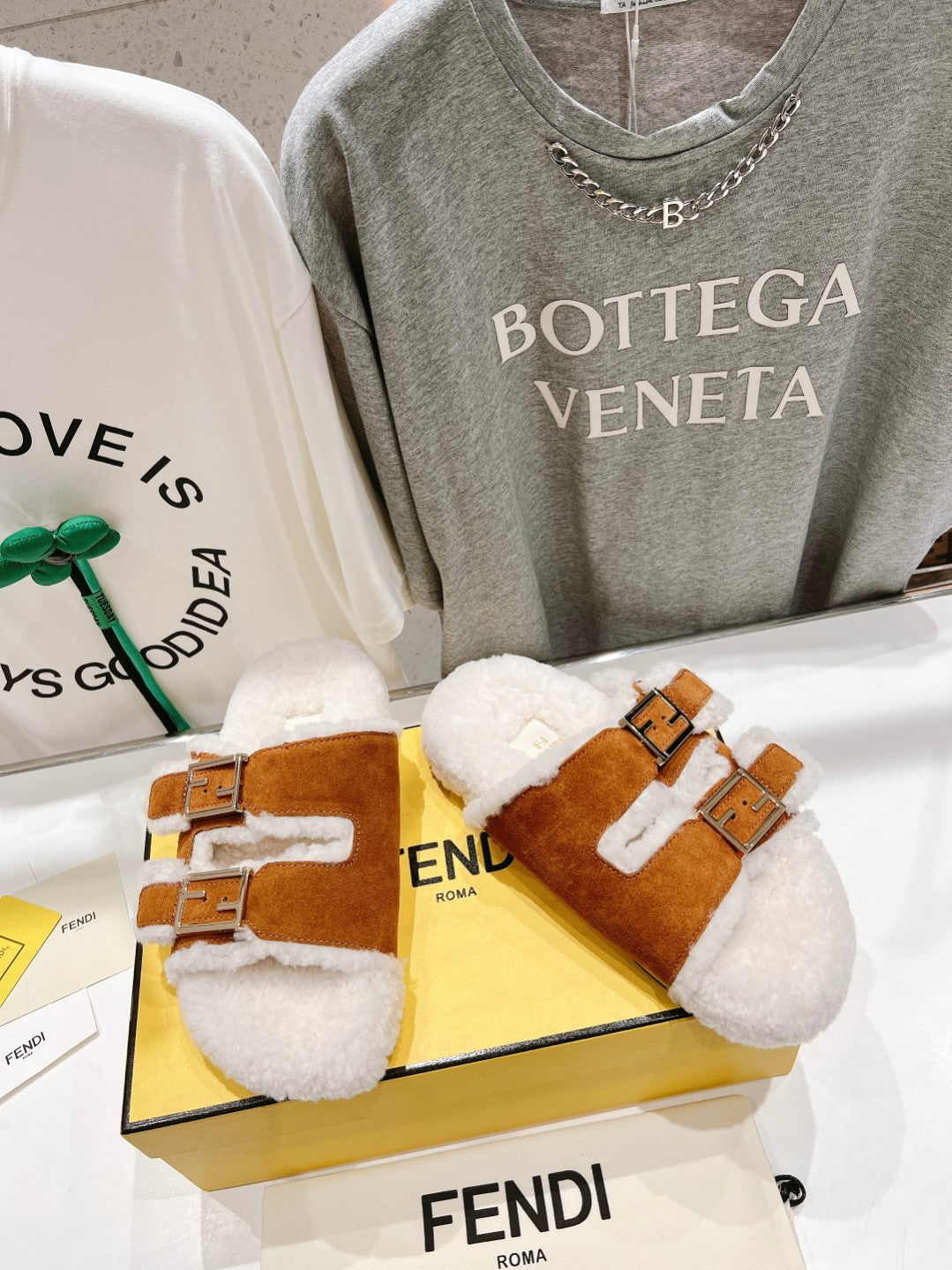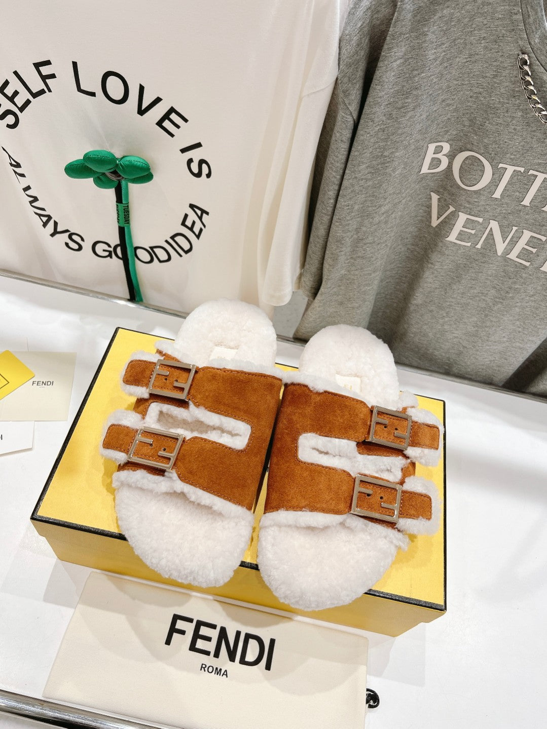 FENDI DAD SANDAL MULE IN BRONZE BROWN SUEDE WITH WHITE FLEECE