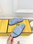 FENDI LOGO SLIDES IN BLUE POWDER CALFSKIN