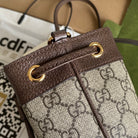 OPHIDIA MINI BUCKET BAG 18 WITH WEB IN BEIGE EBONY CANVAS MIX BROWN CALFSKIN