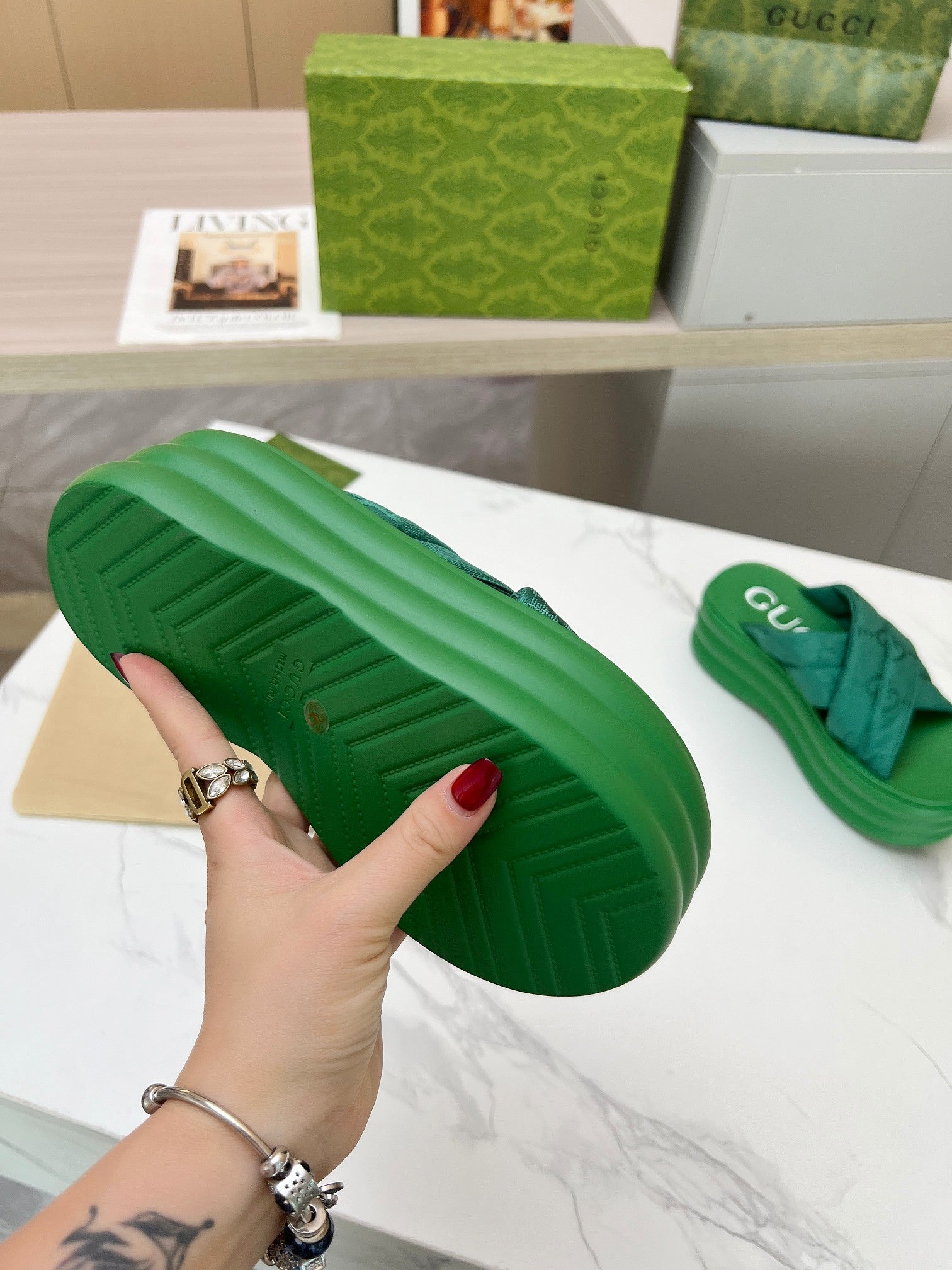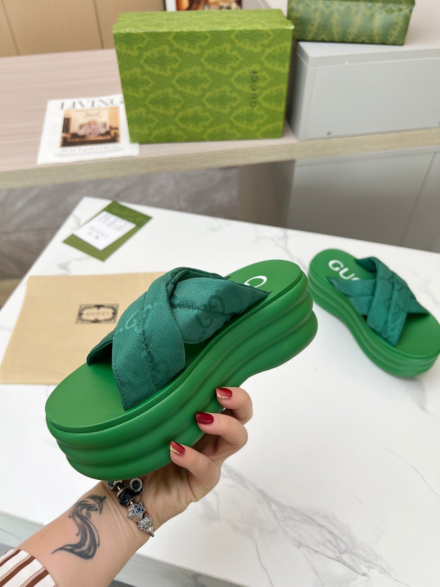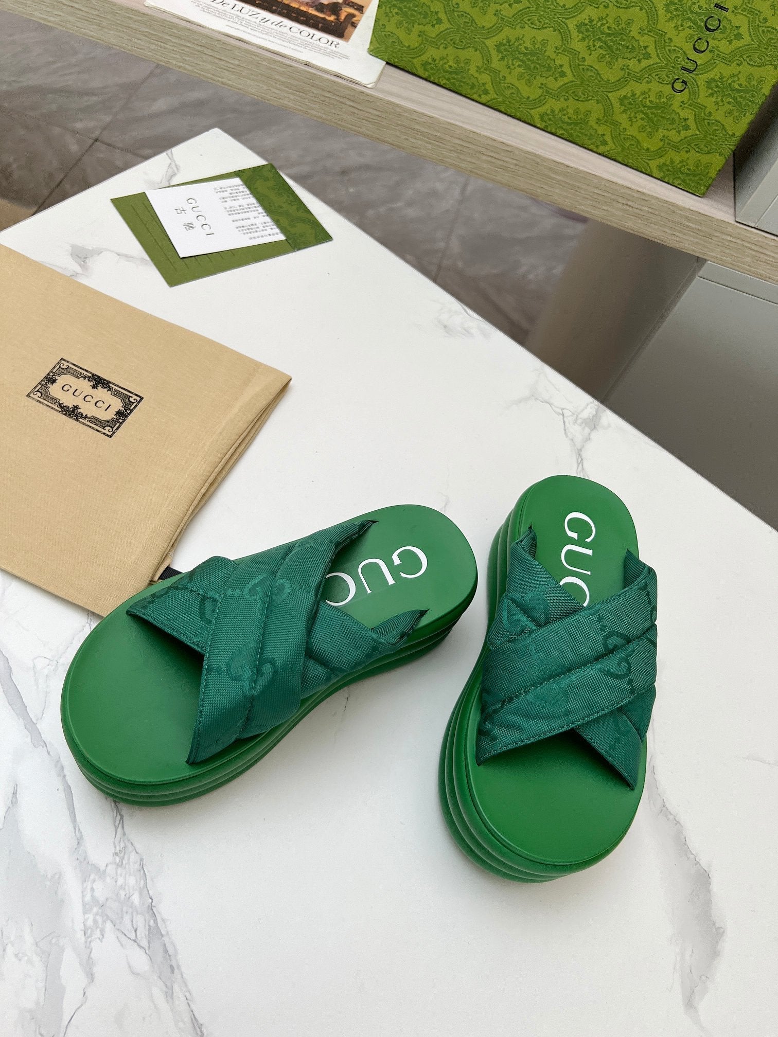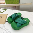 GG waterproof platform slippers green fabric