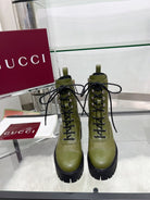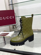 GG Platform Combat Boots Olive Green Logo Embossed Cowhide 476790