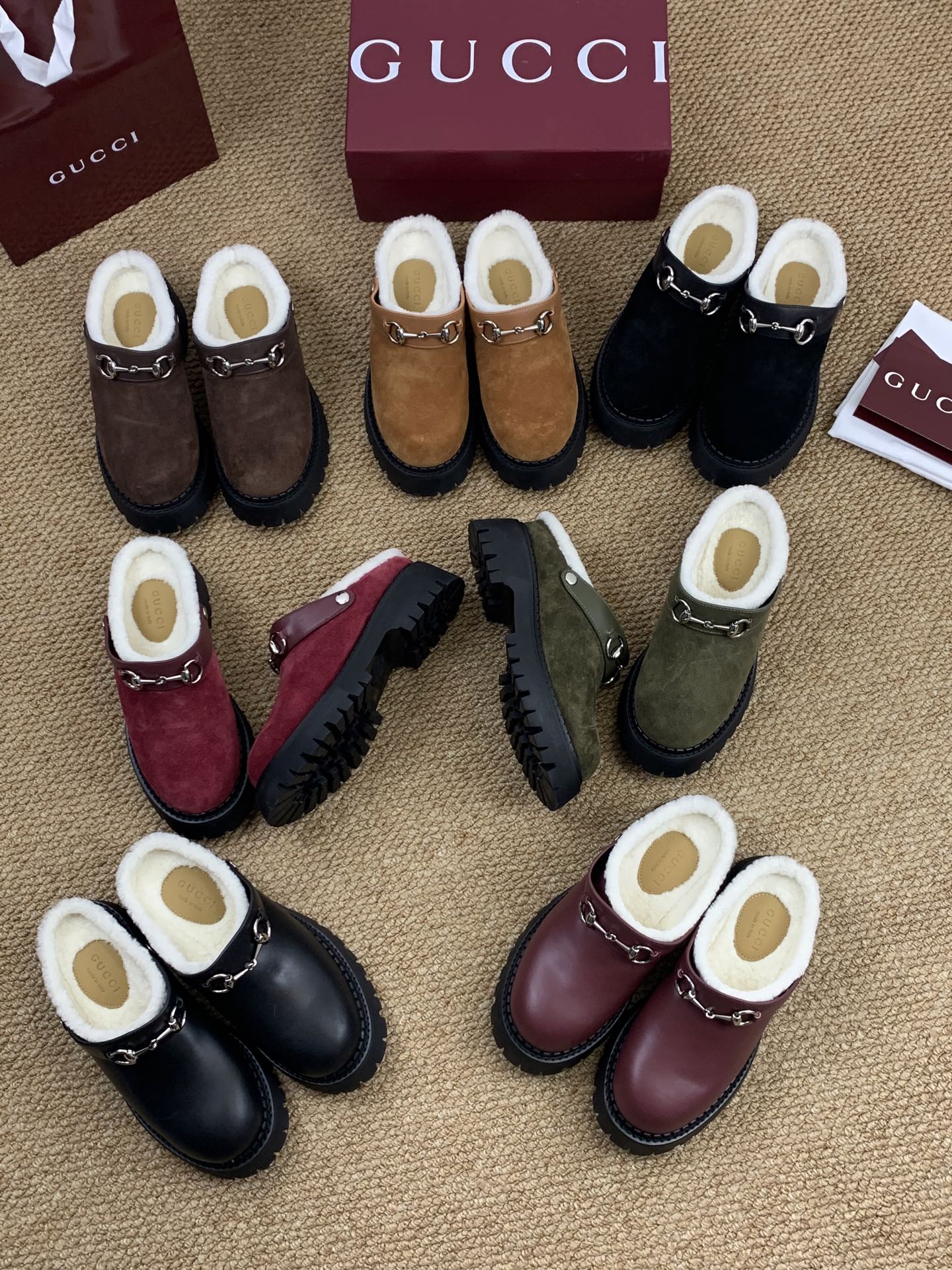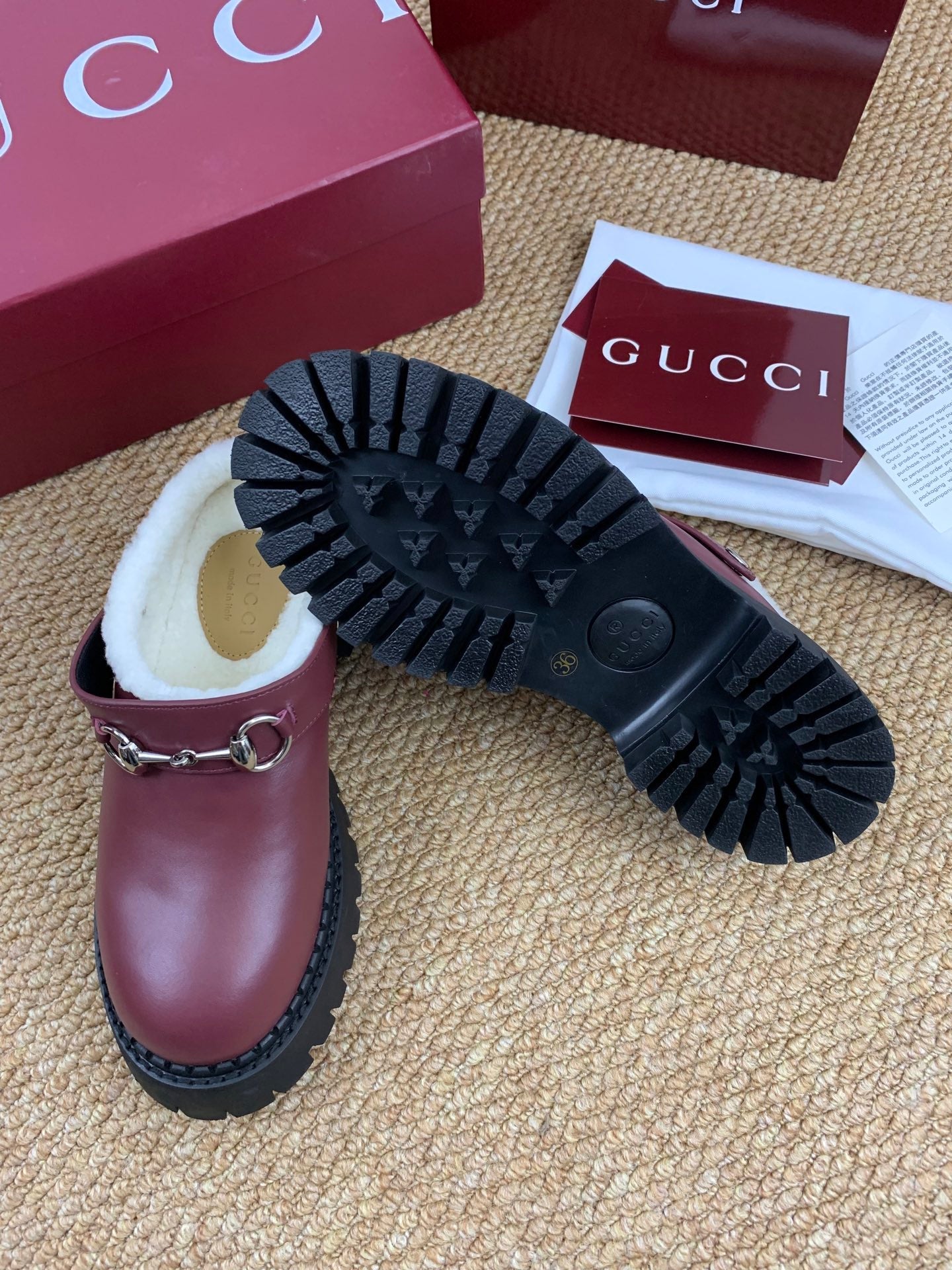 Gucci FW 25 Horsebit Suede Clog Deep Burgundy Leather with Shearling 506442
