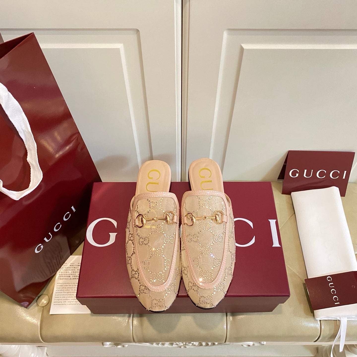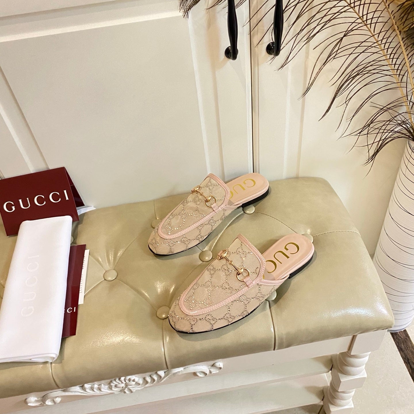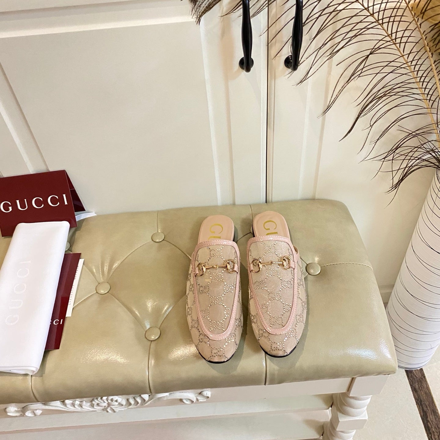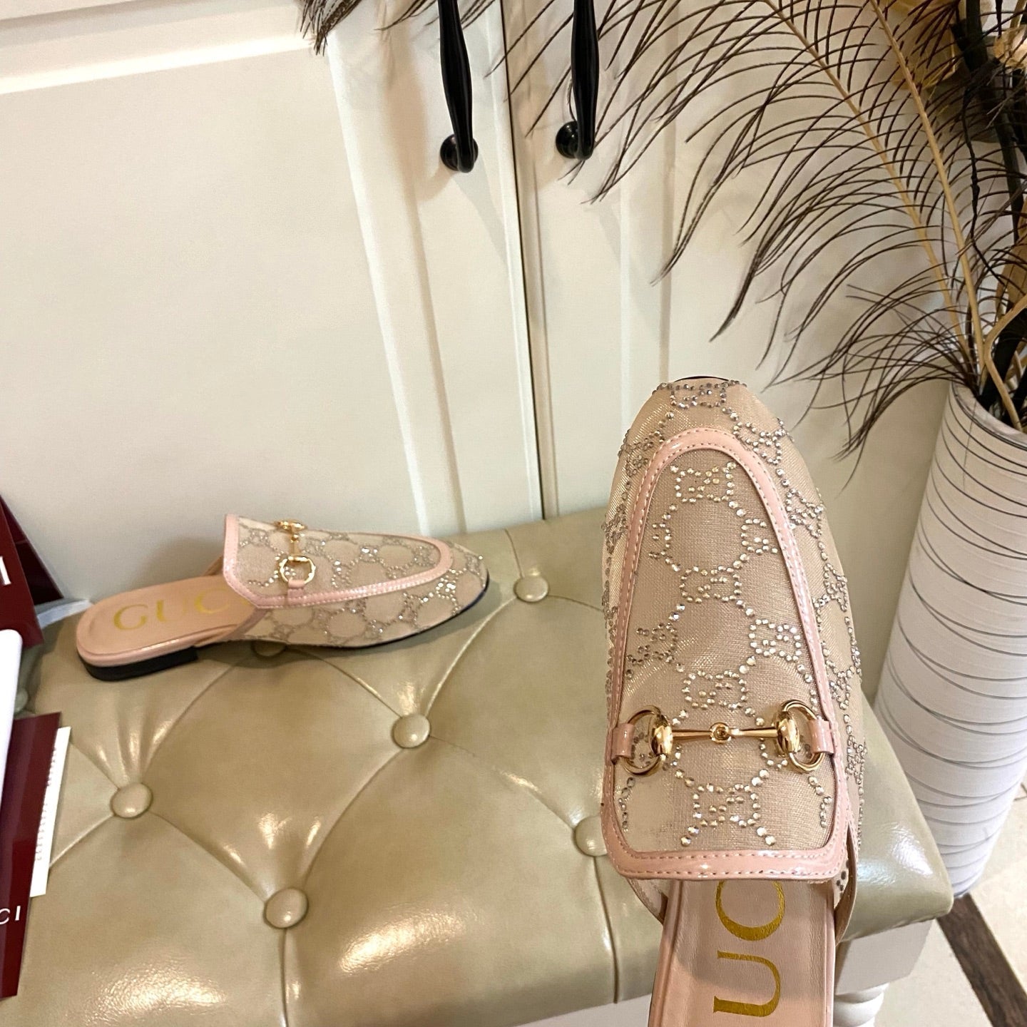 GG Horsebit Slingback Flat Beige Ebony Monogram Canvas Point Toe Crystal-Embellished