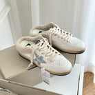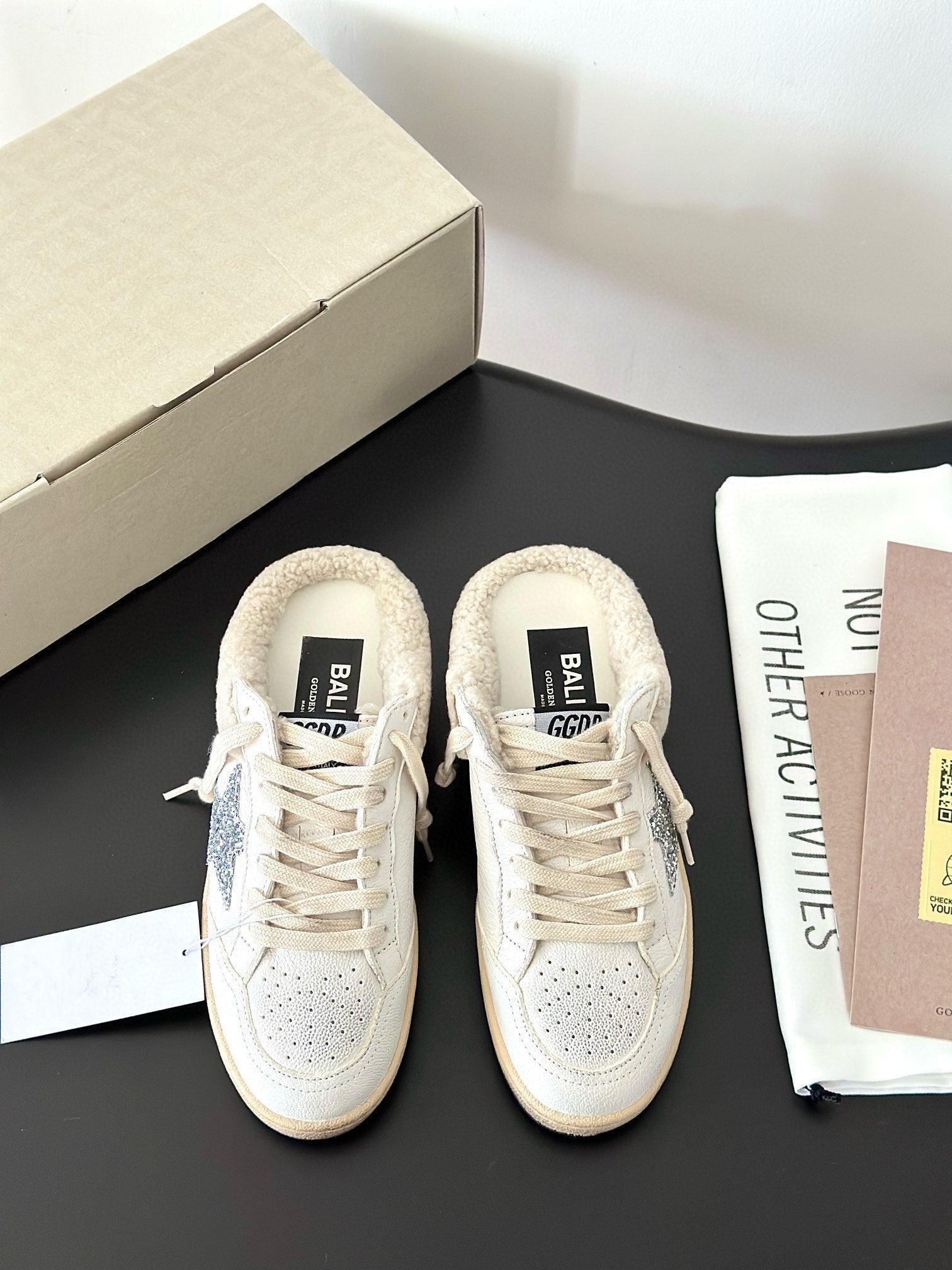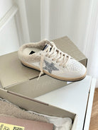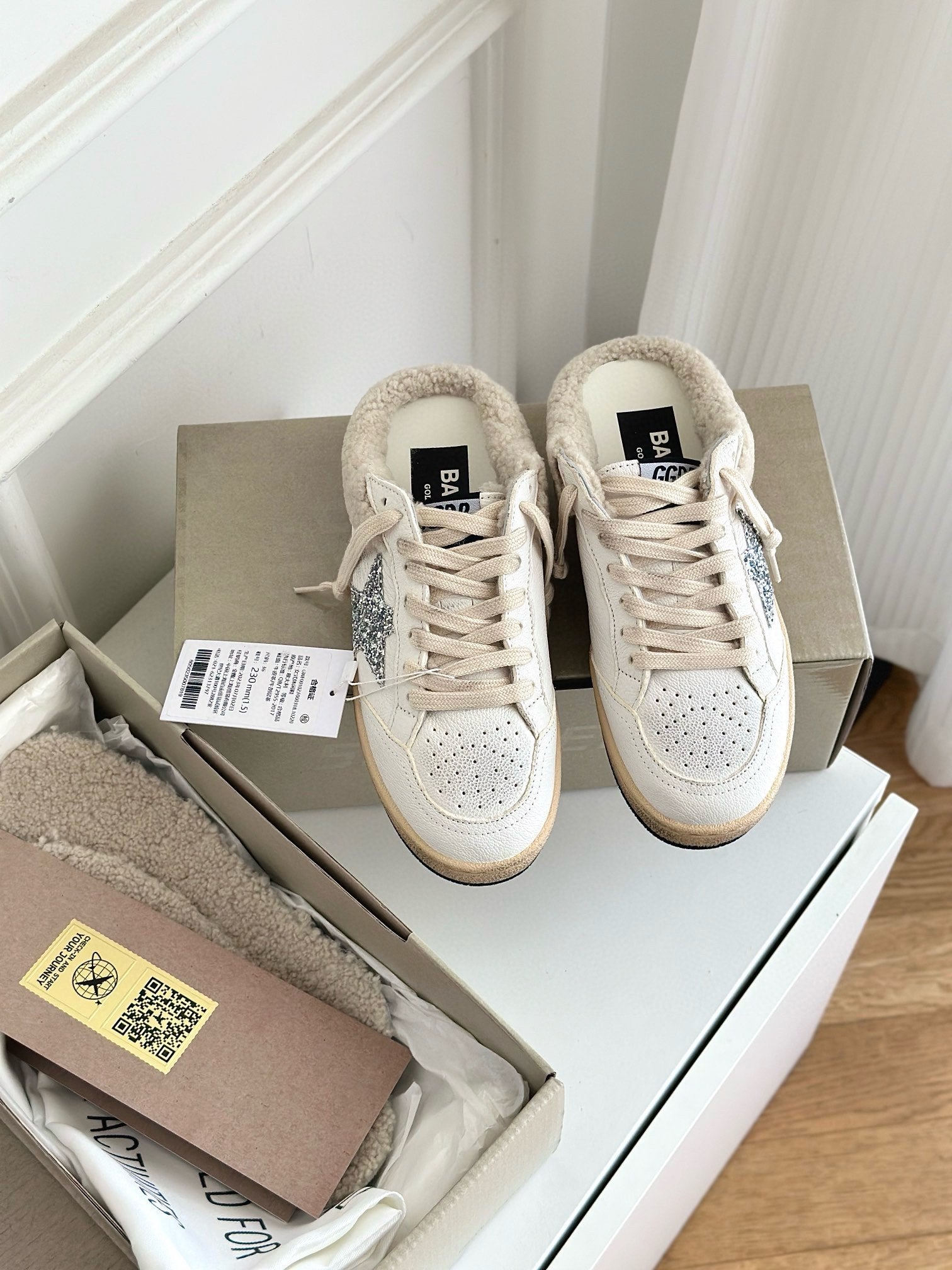 SUPER-STAR SABOTS IN WHITE CALFSKIN SHEARING LINING AND GLITTER WHITE STAR