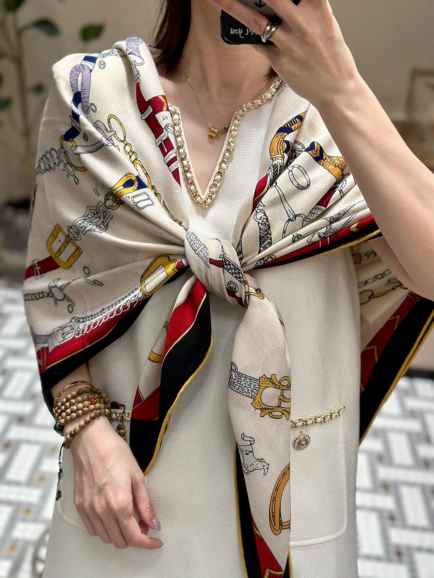 Chevaux Dechaines Shawl 135 CM IN Red Colorful Cashmere Silk 373683