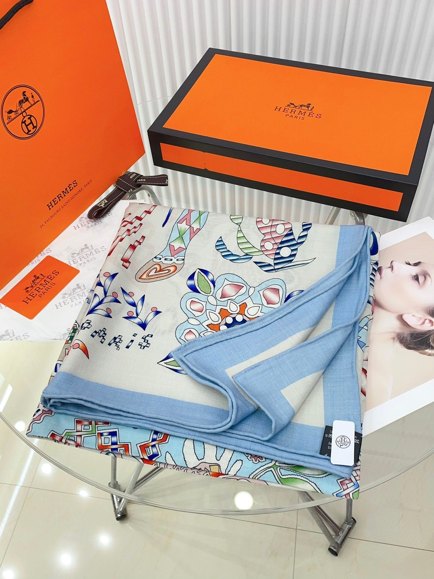 En Attendant Ulysse Shawl 140 CM In Light Blue Colorful Cashmere And Silk 294497