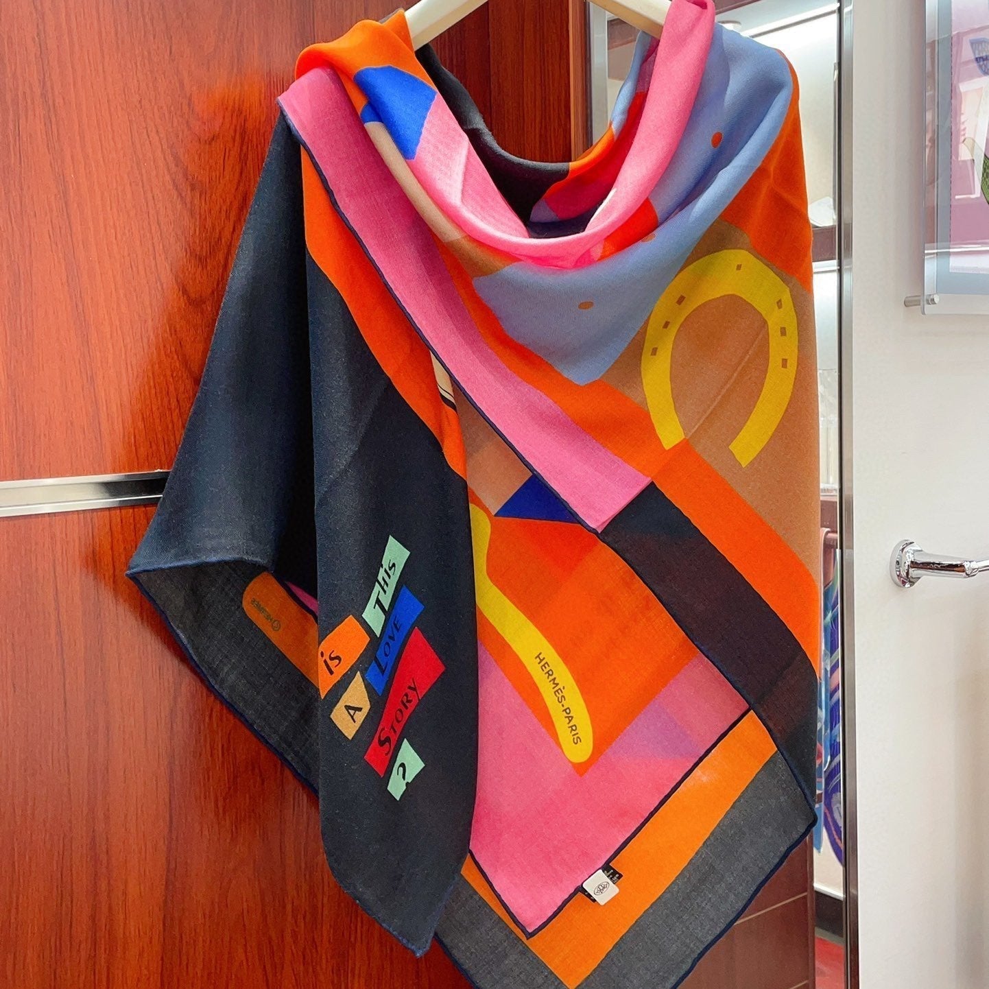 HM Lettres Equestre Scarf 140 CM In Orange Green Colorful Cashmere And Silk 359398