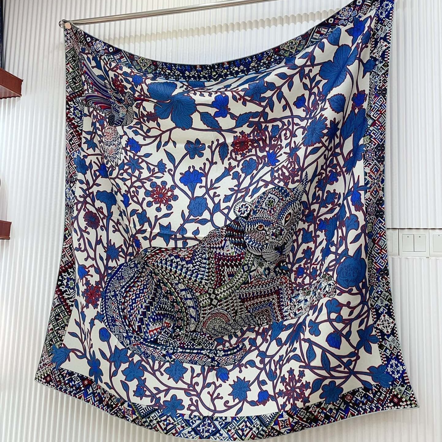 Jungle Love Stamped Scarf 140 CM In Blue Colorful Cashmere And Silk 210984