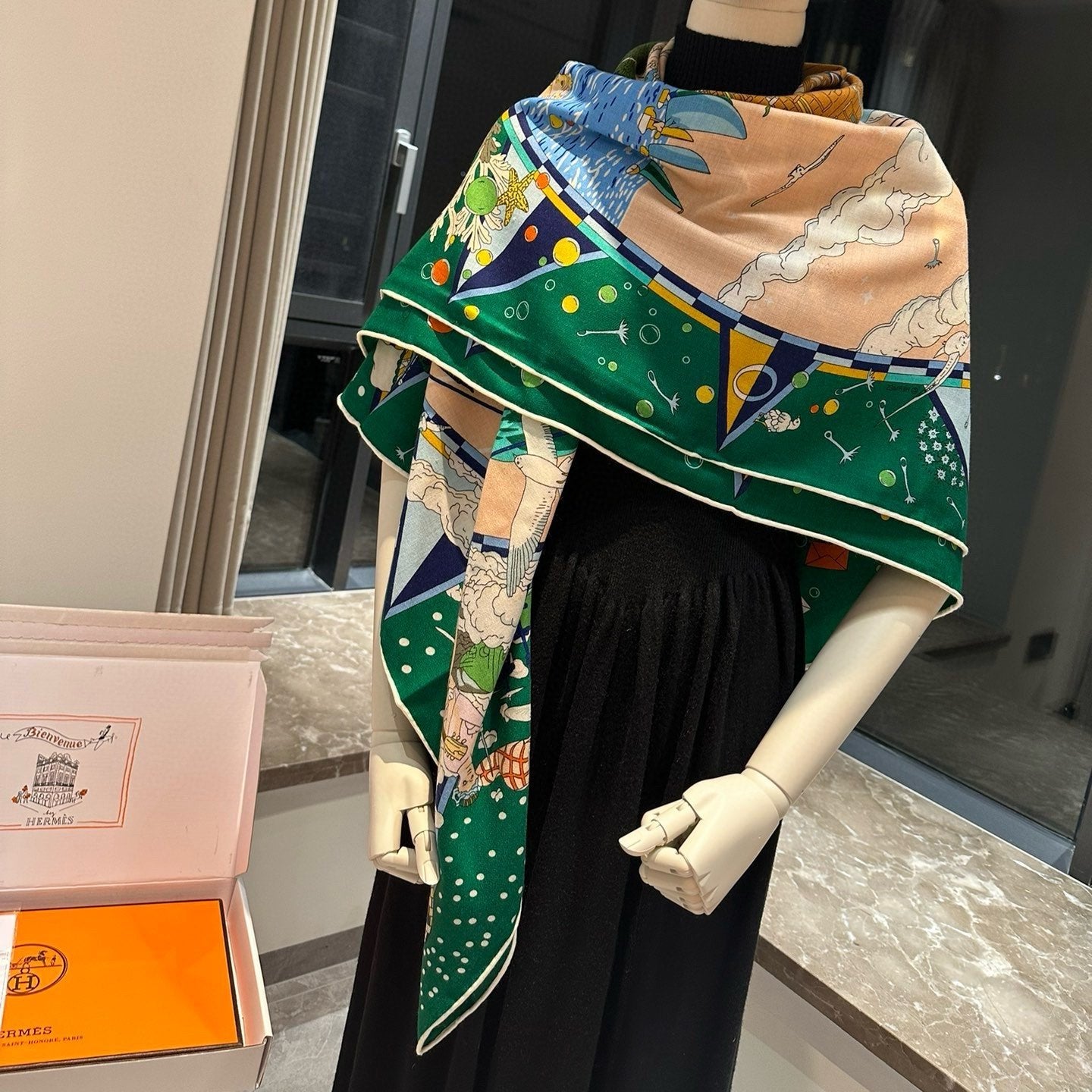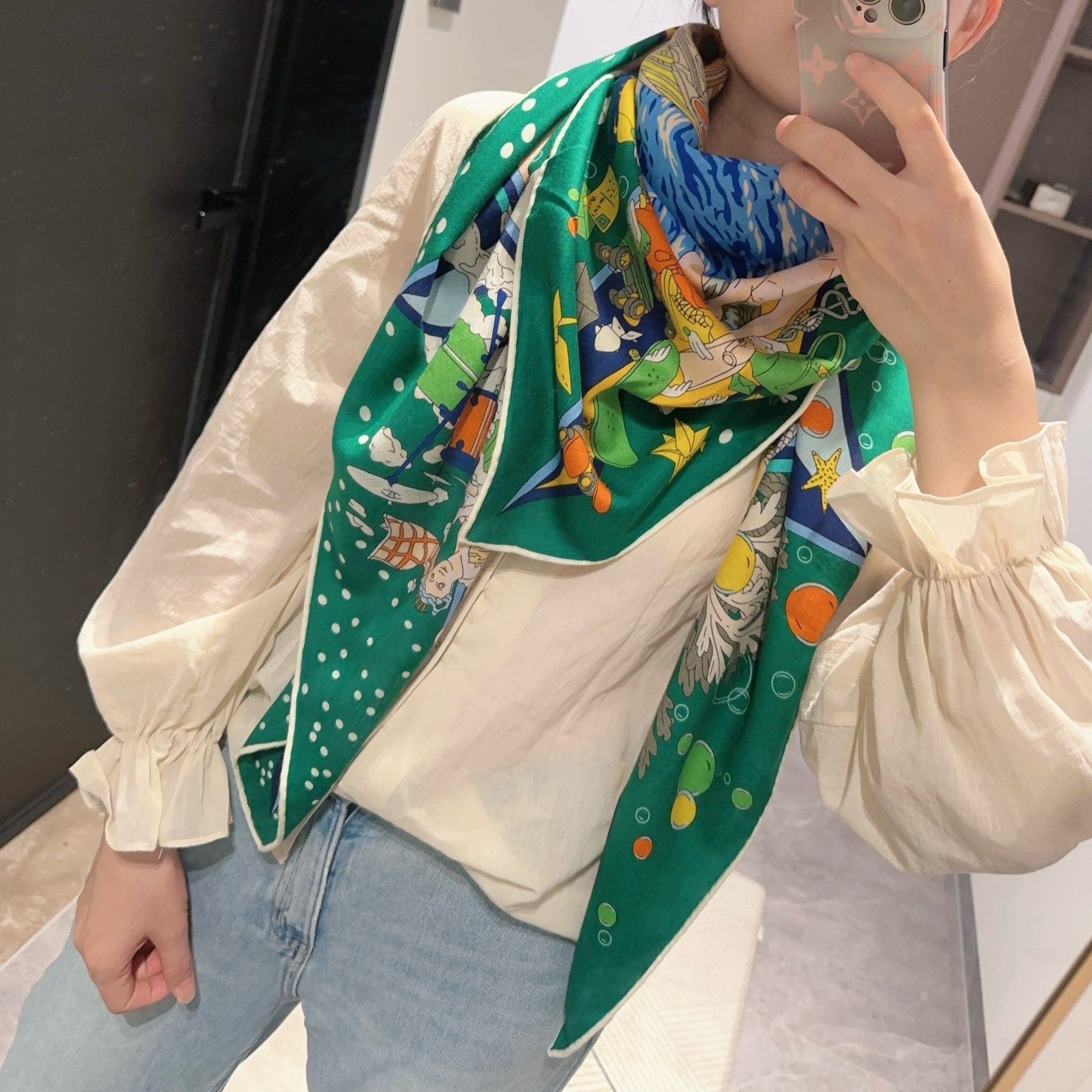 Fantaisie d'Etriers Shawl 140 CM Green Mix Blue Colorful Silk