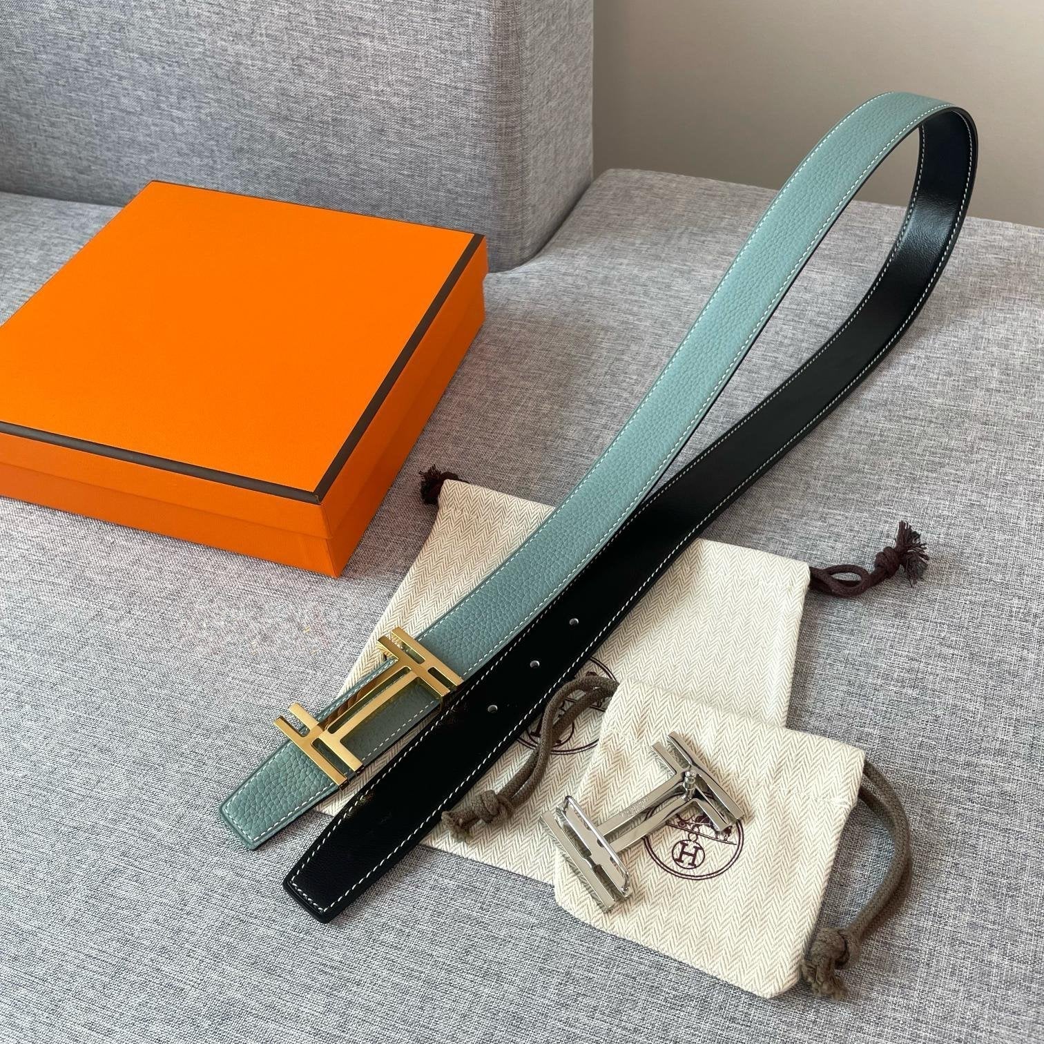 DOUBLE H REVERSIBLE BELT 32MM GOLD BUCKLE BLACK SKY BLUE LEATHER