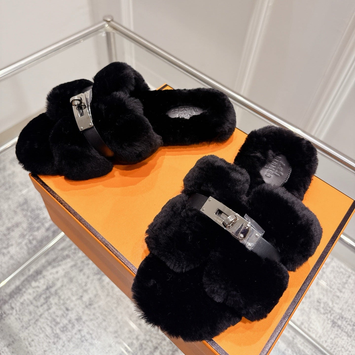 HM 25s H Shaped Slipper with Buckle Dark Brown Shearling 462194
