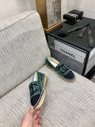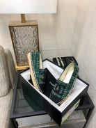 ESPADRILLE FOREST GREEN TWEED FABRIC AND BLACK CALFSKIN FLATS