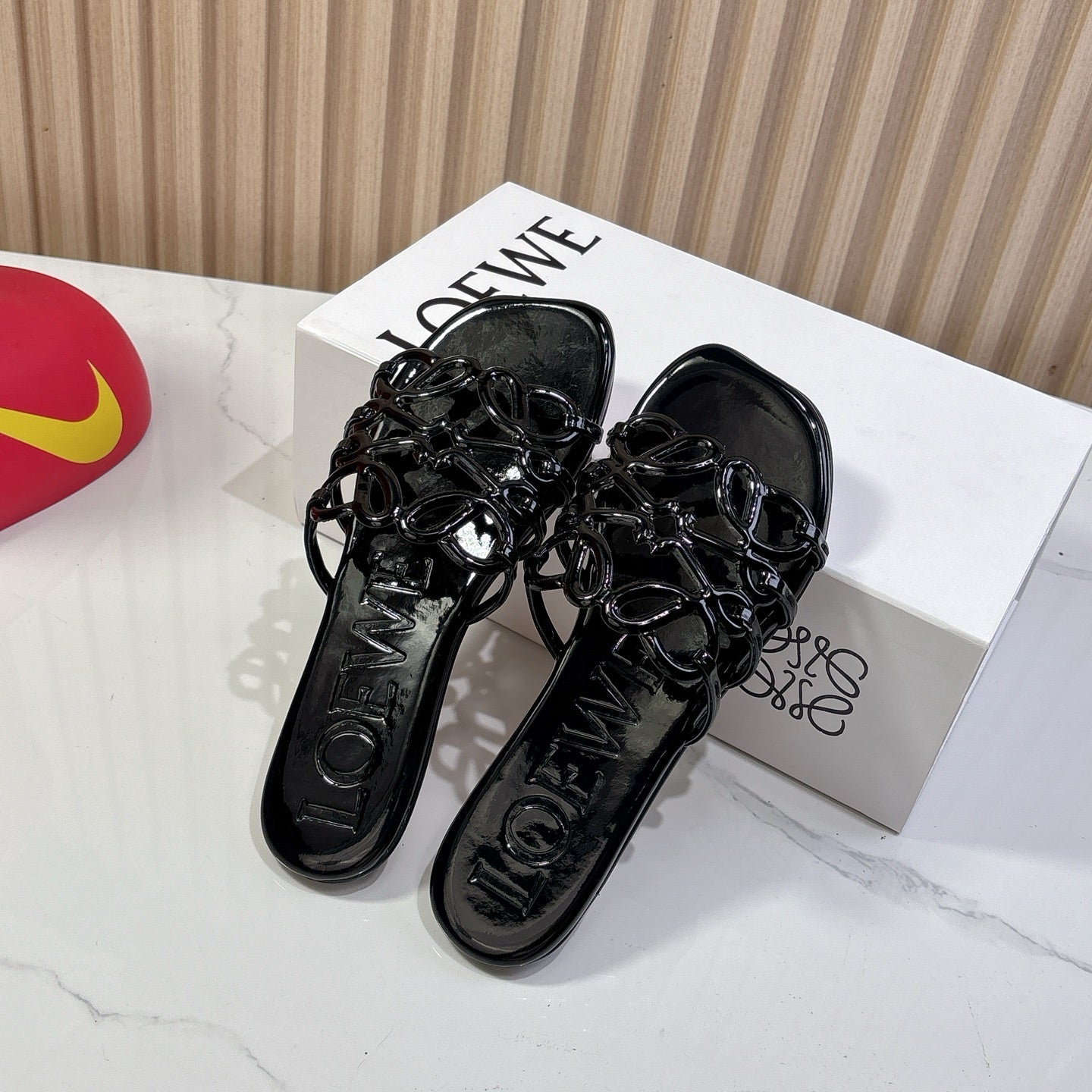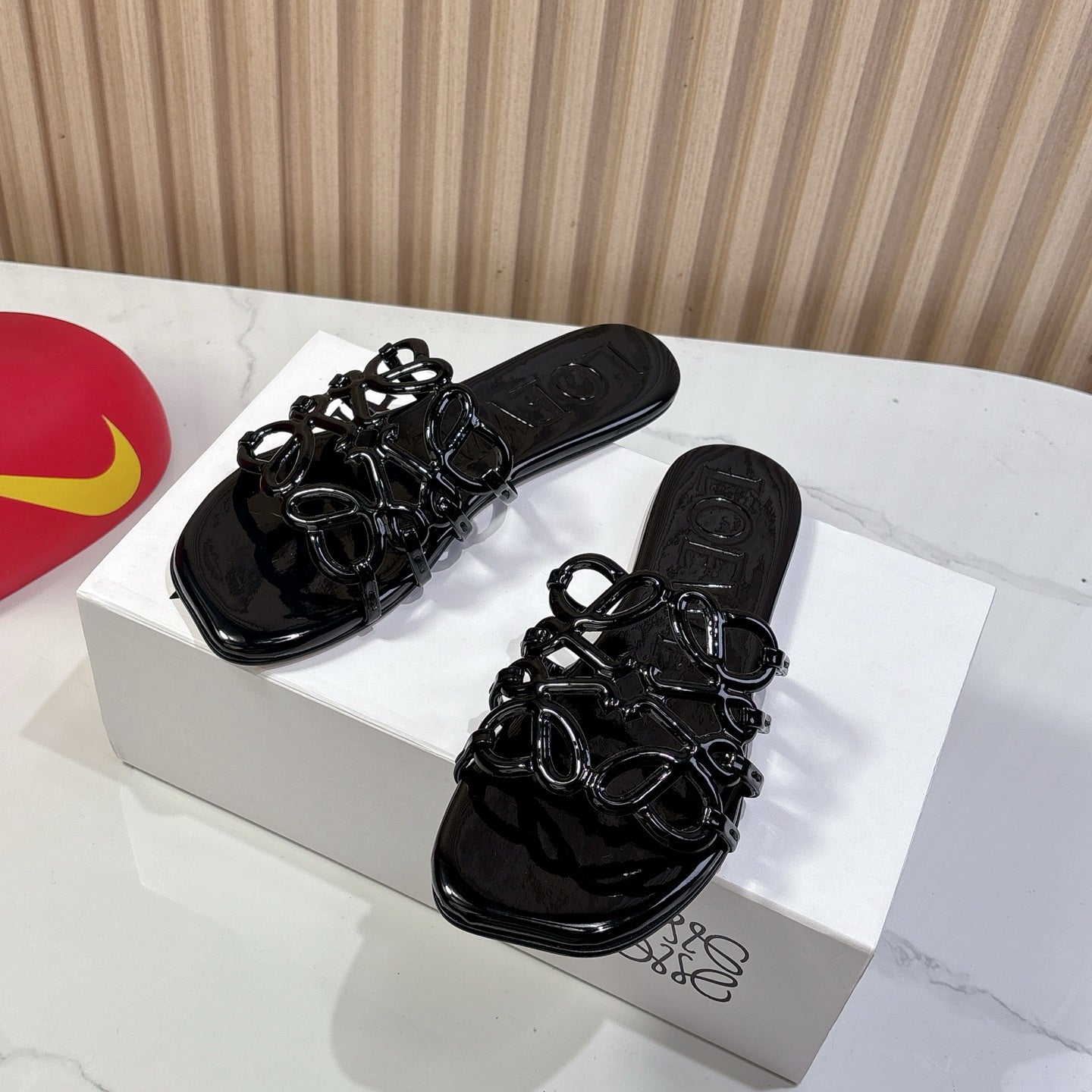 Petal Anagram Slide in Black Patent Calfskin 273744