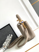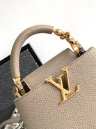 CAPUCINES MINI 21 IN KHAKI BROWN TAURILLON GOLD HARDWARE