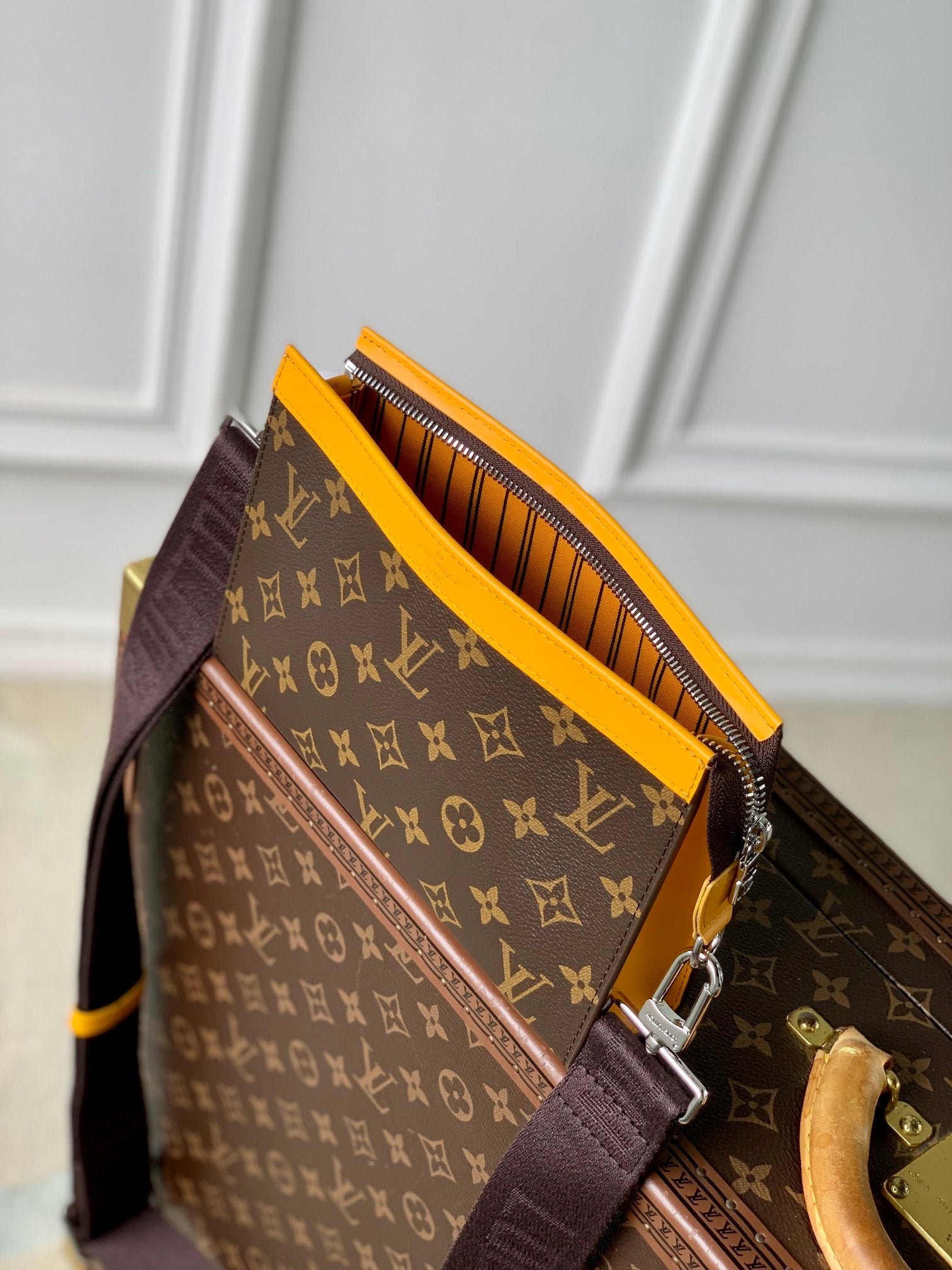 GASTON WEARABLE WALLET 18 IN BROWN MONOGRAM CANVAS MIX YELLOW CALFSKIN
