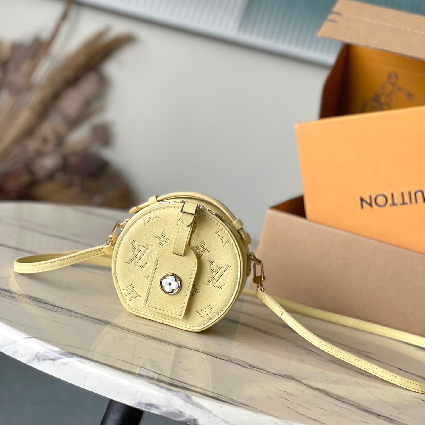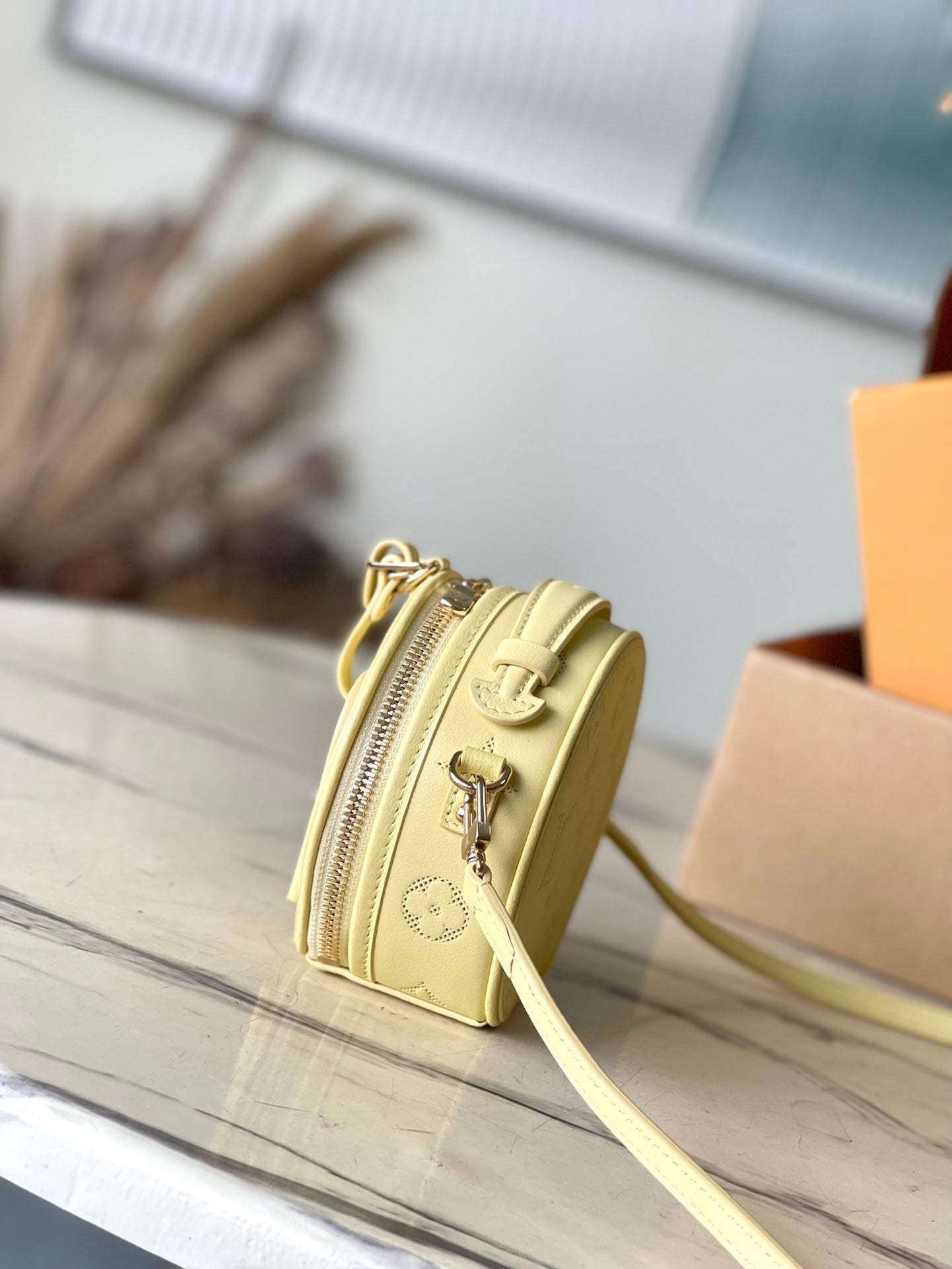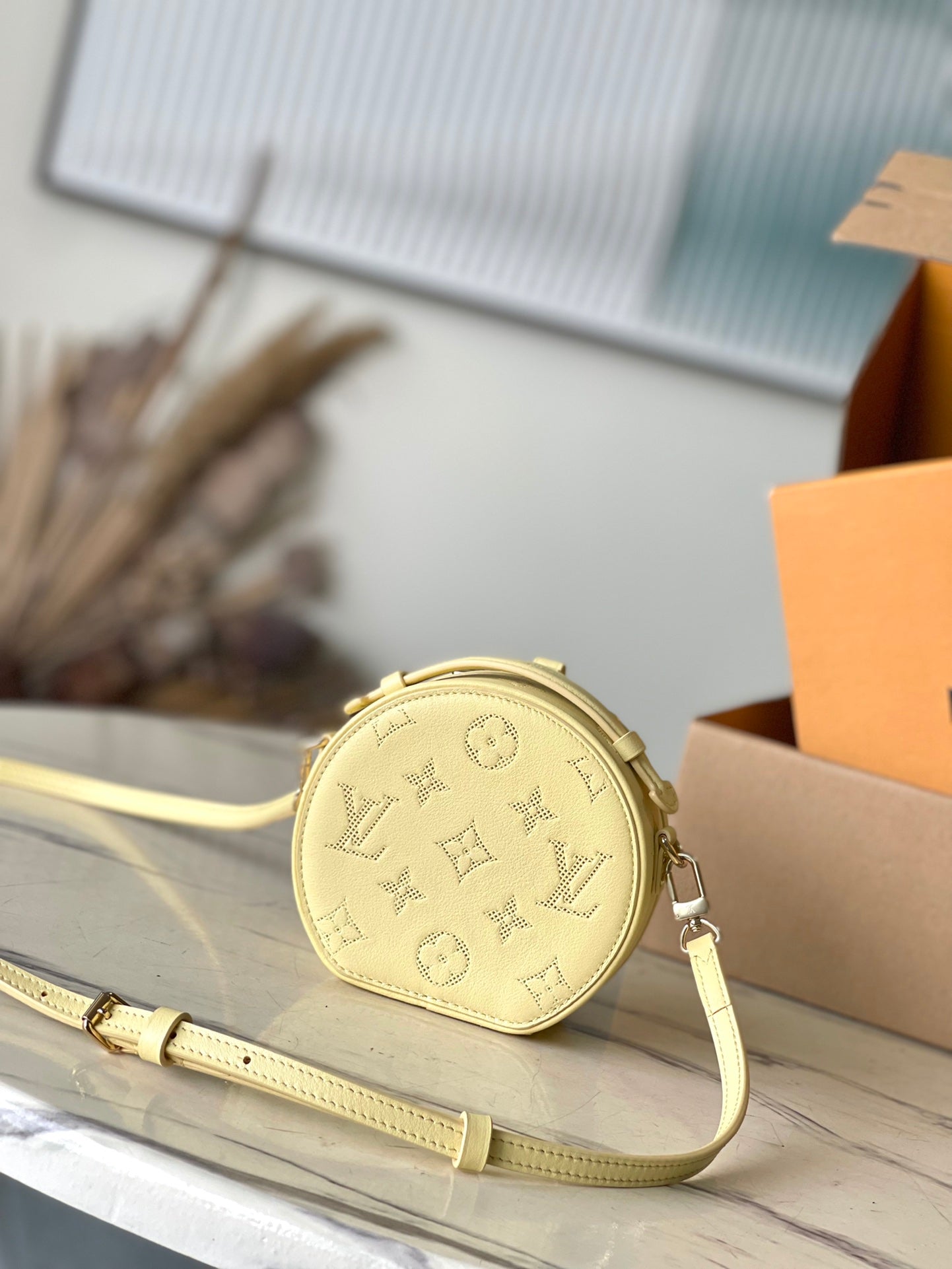 MINI BOITE CHAPEAU 13 IN BANANA YELLOW MONOGRAM PERFORATED CALFSKIN