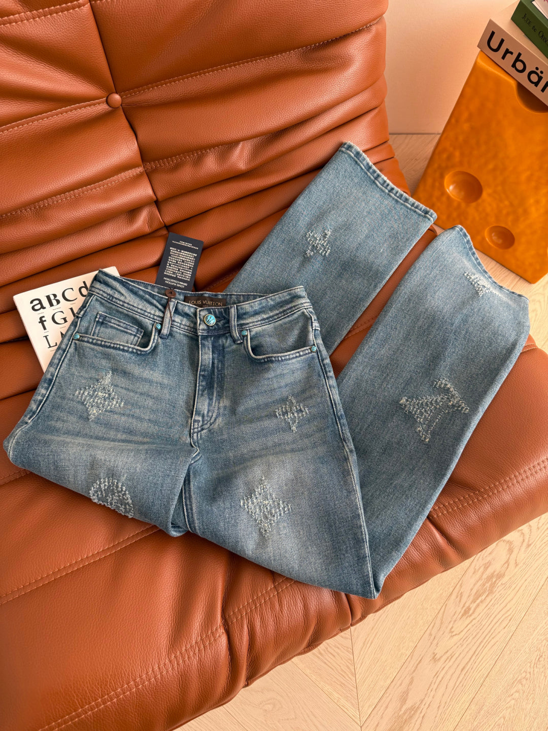 LV 25 Ripped Craft Monochrome Straight-Leg Jeans Blue Cotton