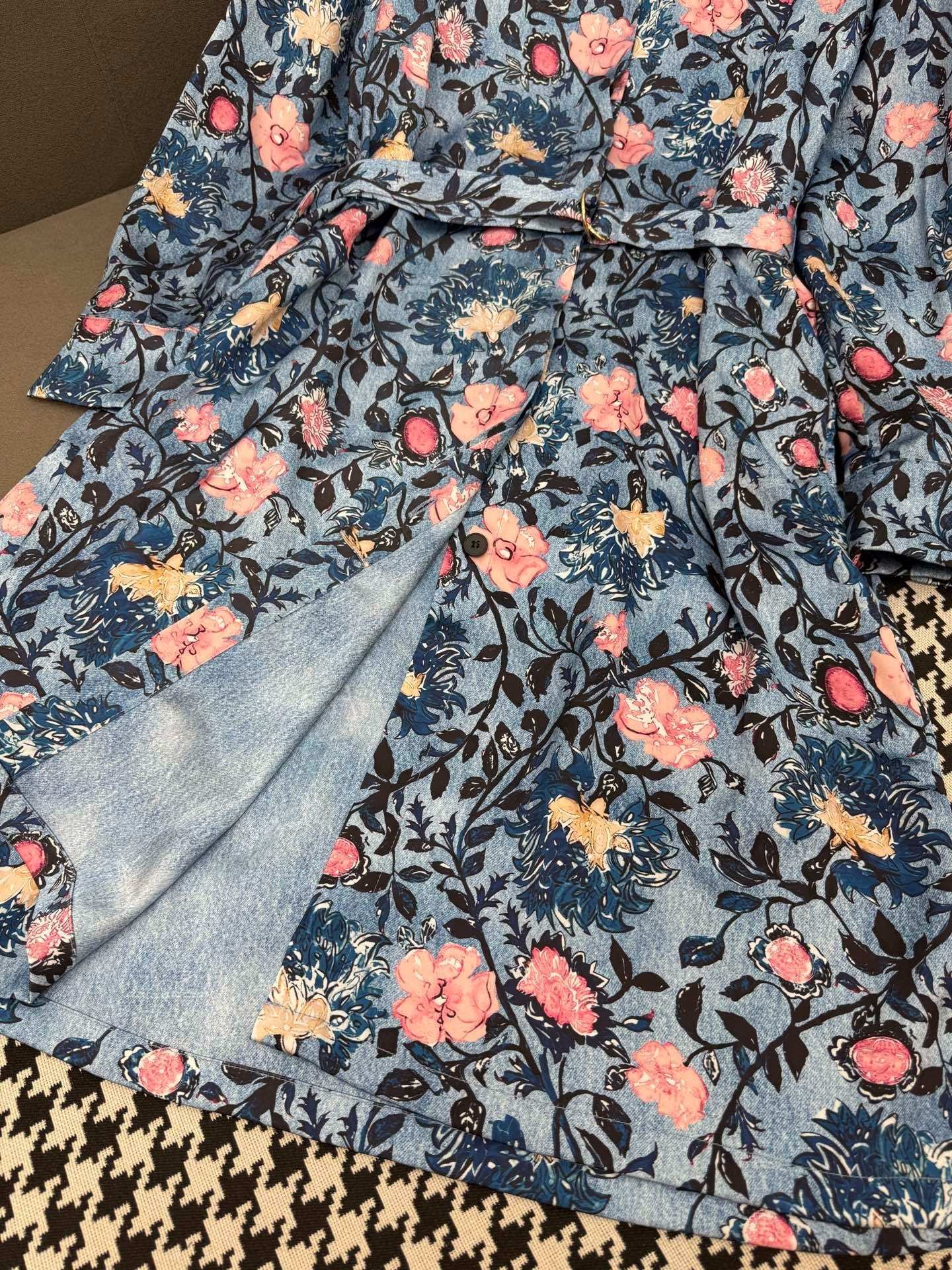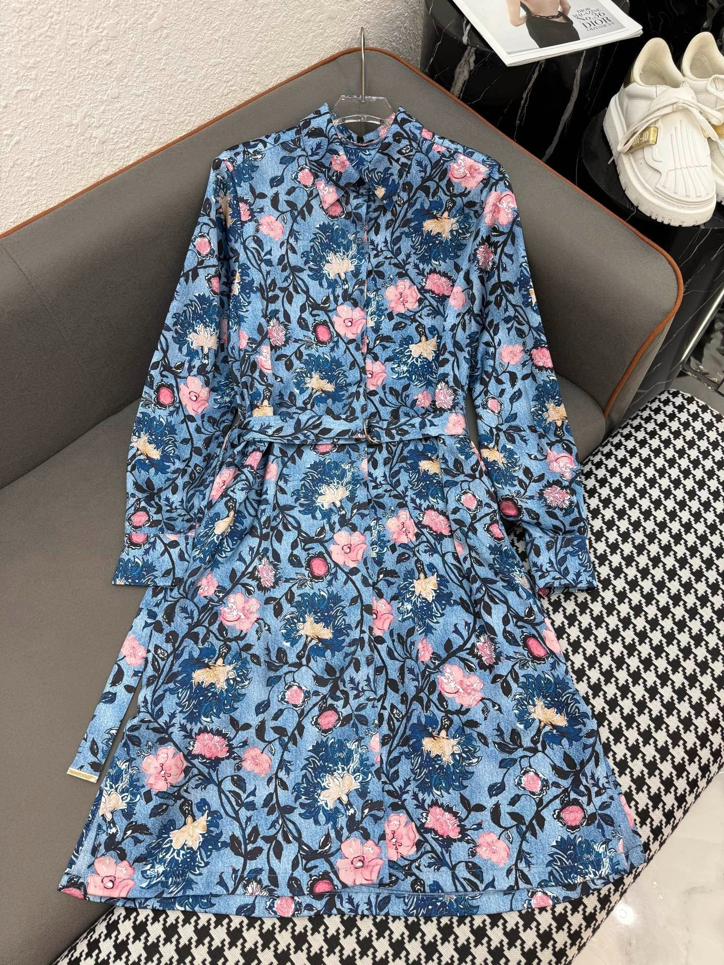 LV LONG-SLEEVE FLORAL PRINT SHIRT DRESS IN BLUE