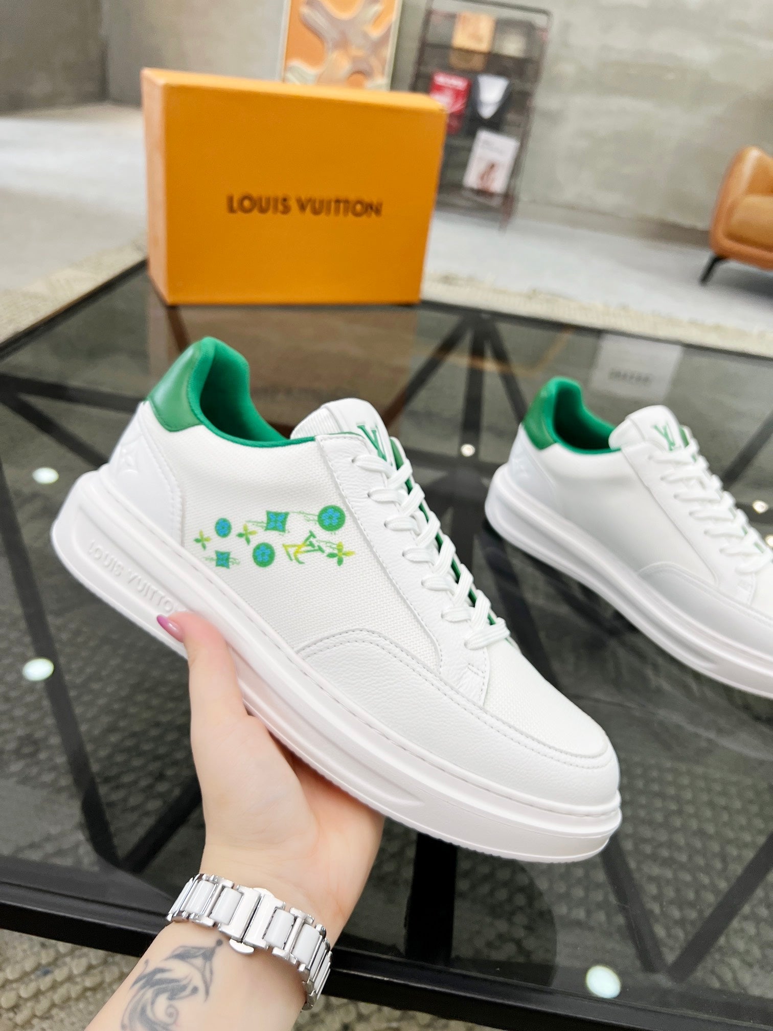 BEVERLY HILLS TRAINERS WHITE MIX COOL GREEN CALFSKIN AND MESH FABRIC