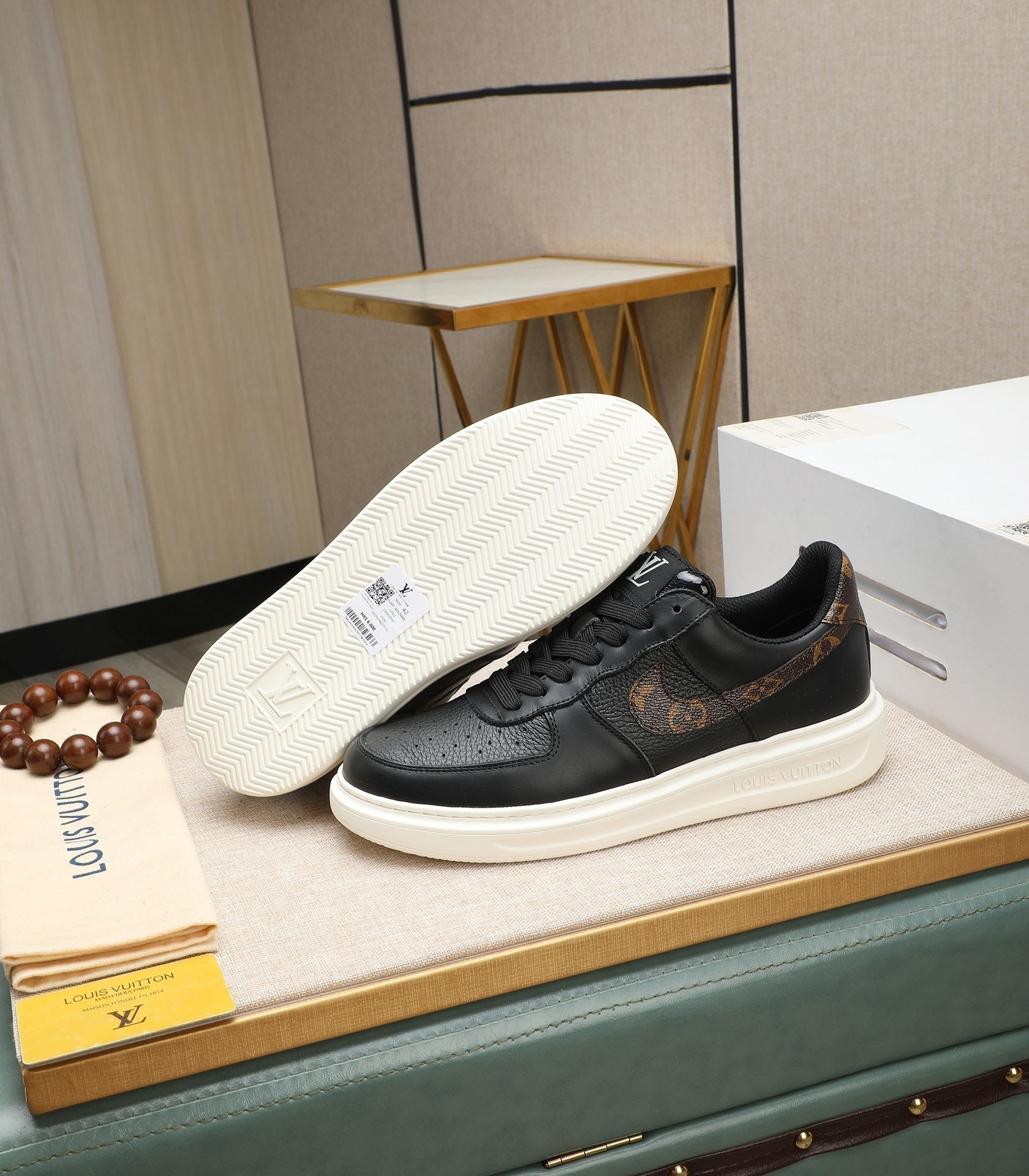 LV AIR FORCE 1 GLOSSY BLACK CALFSKIN WITH BROWN MONOGRAM LOGO