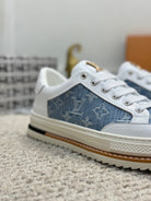 LV TRAINERS IN WHITE CALFSKIN AND SAPPHIRE BLUE JACQUARD