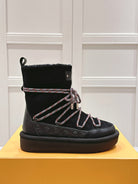 ASPEN PLATFORM ANKLE BOOT IN BLACK MONOGRAM DEBOSSED SUEDE AND SHEARLING