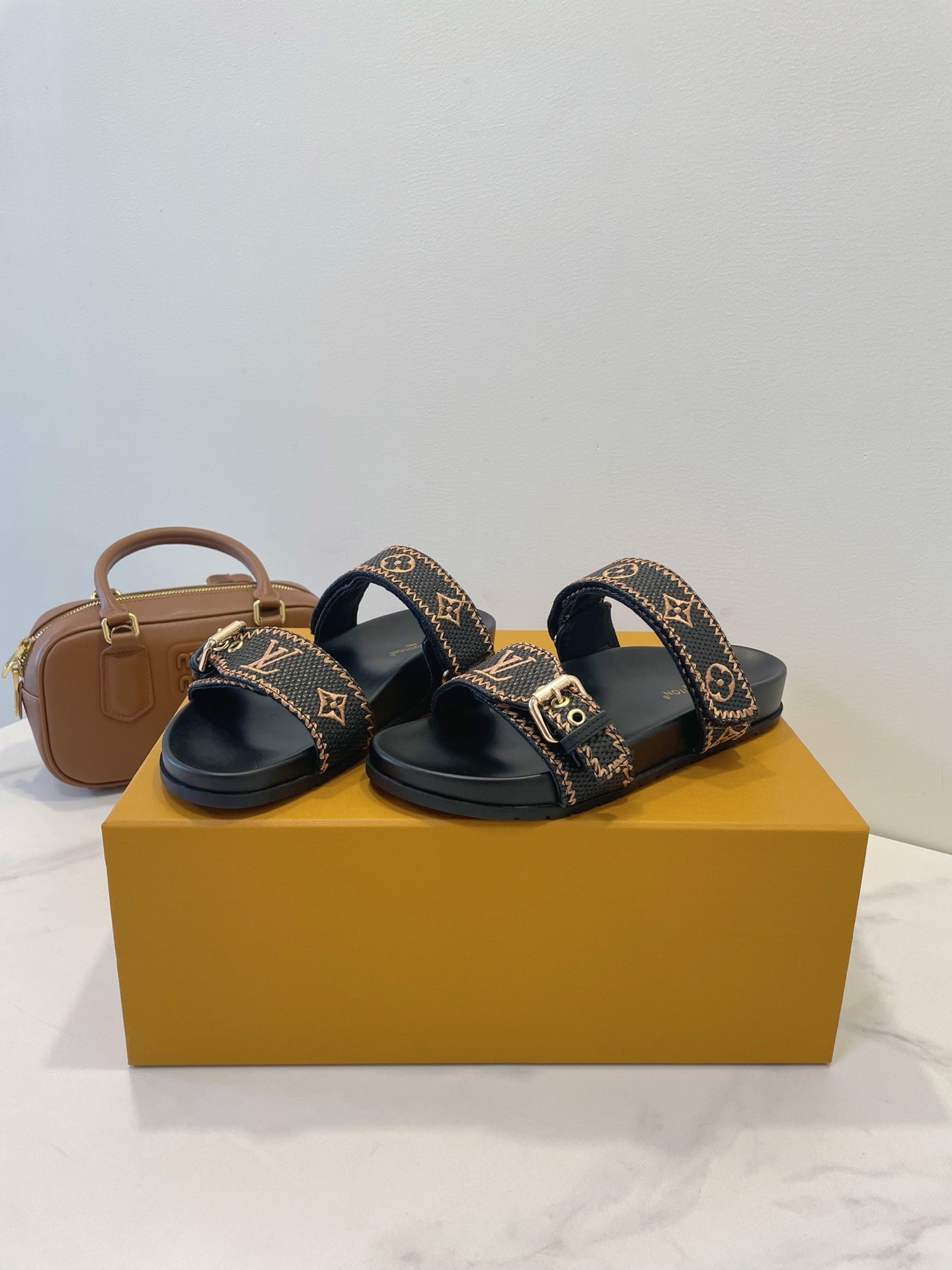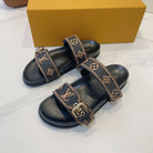 Bom Dia Flat Comfort Mule Brown Black Monogram Embossed Print Classic 241335