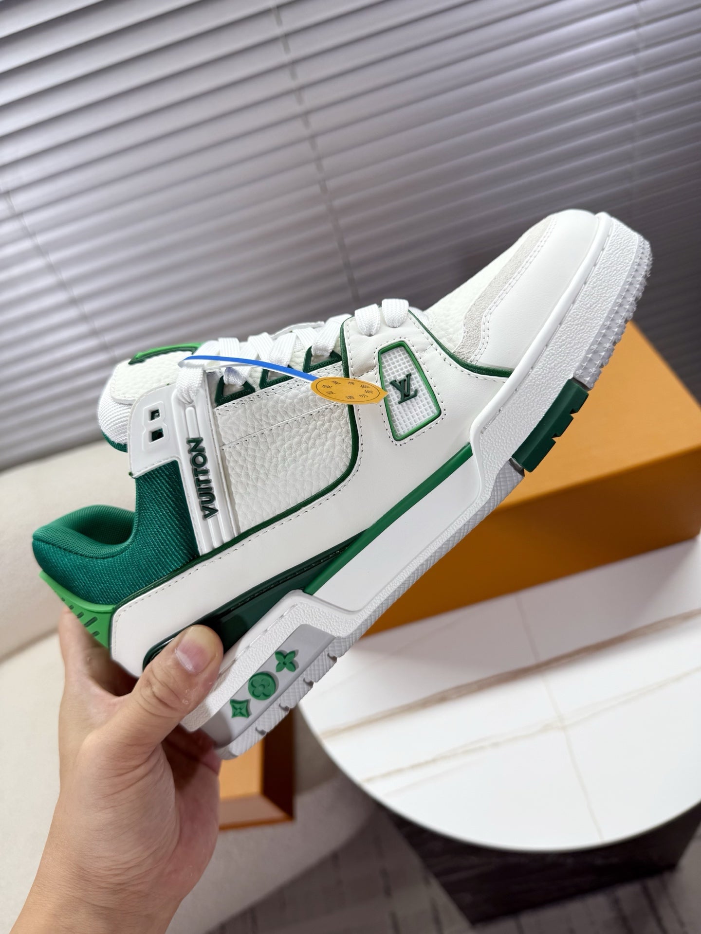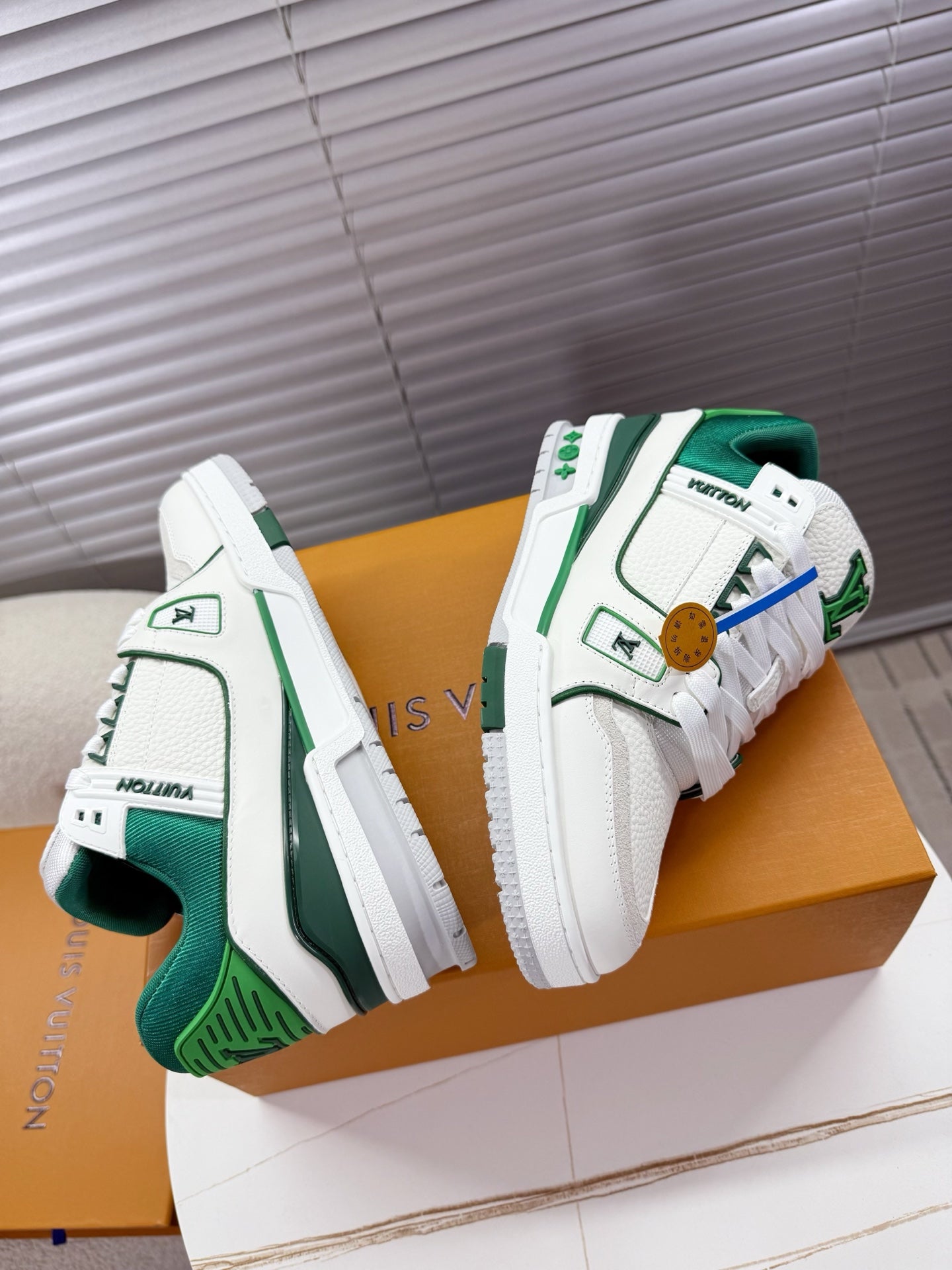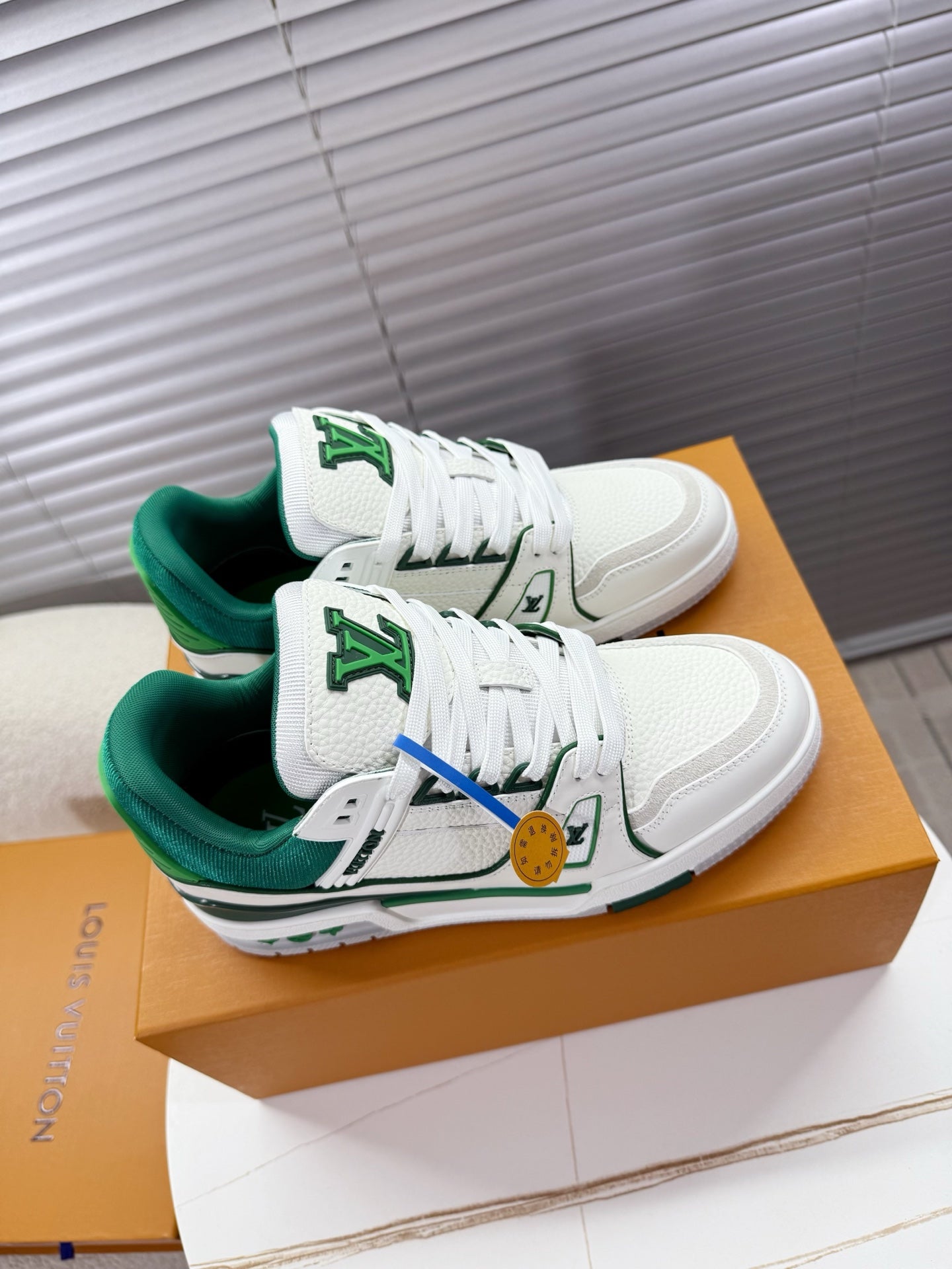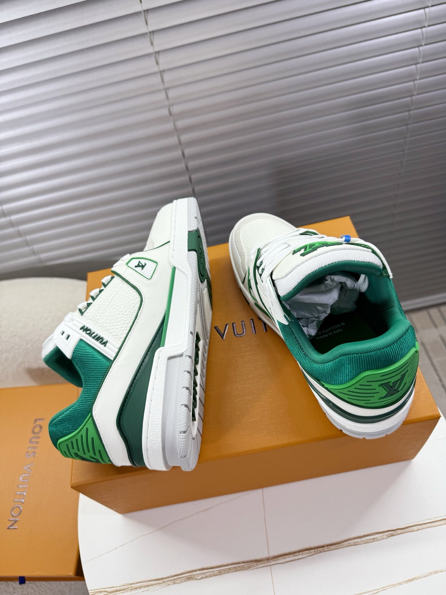 LV 1AIJ41 Trainer Sports Shoes White Green Grained Calfskin 511752