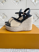 LV Beige·Raffia Straw Wedge Sandals 11.5cm Black Lining Leather 291586