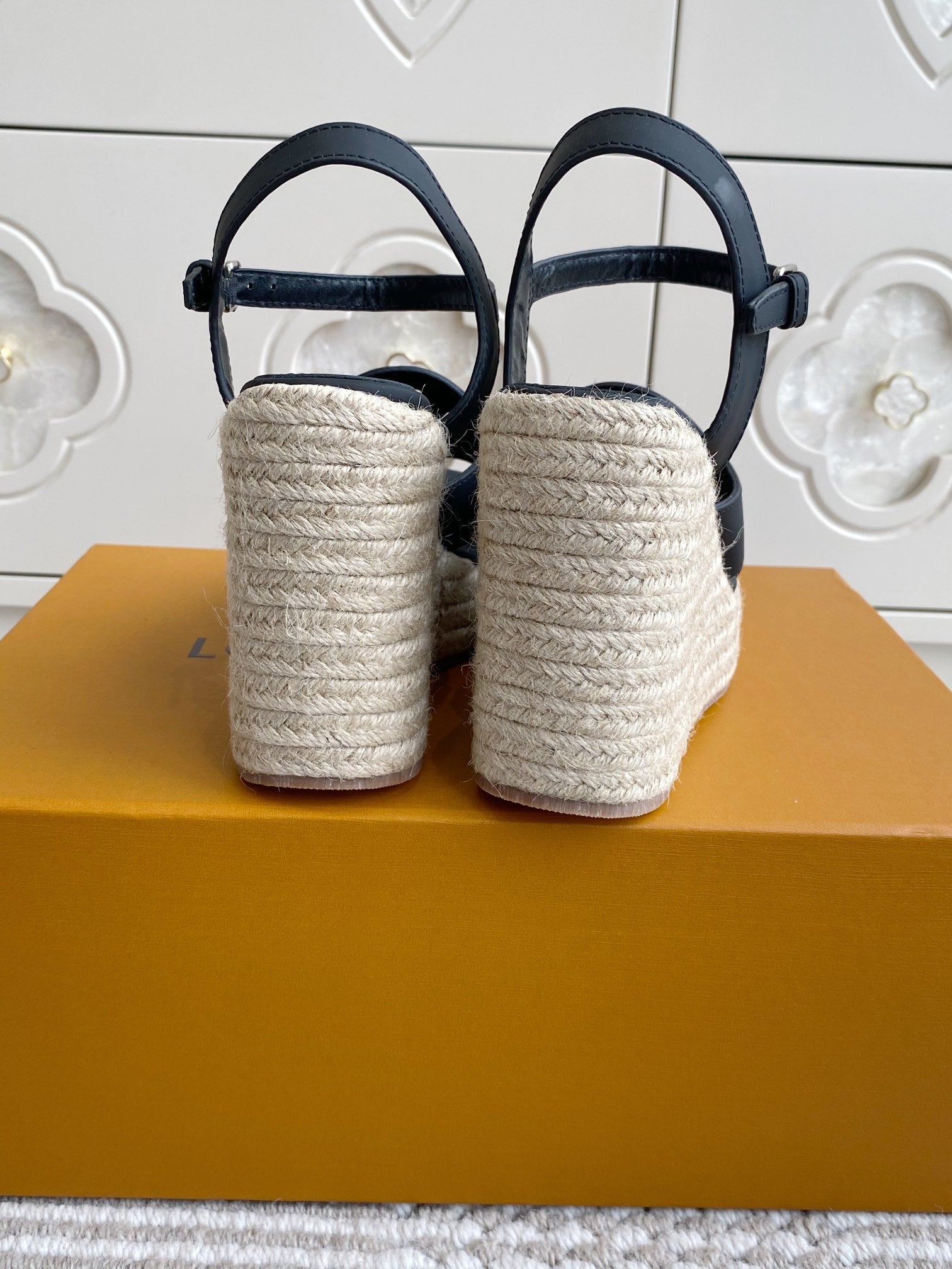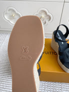 LV Letter Hollow Straw Wedge Sandals 11.5cm Black Cowhide 291576