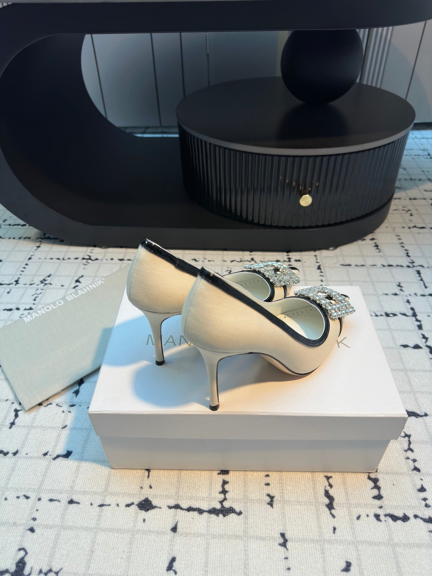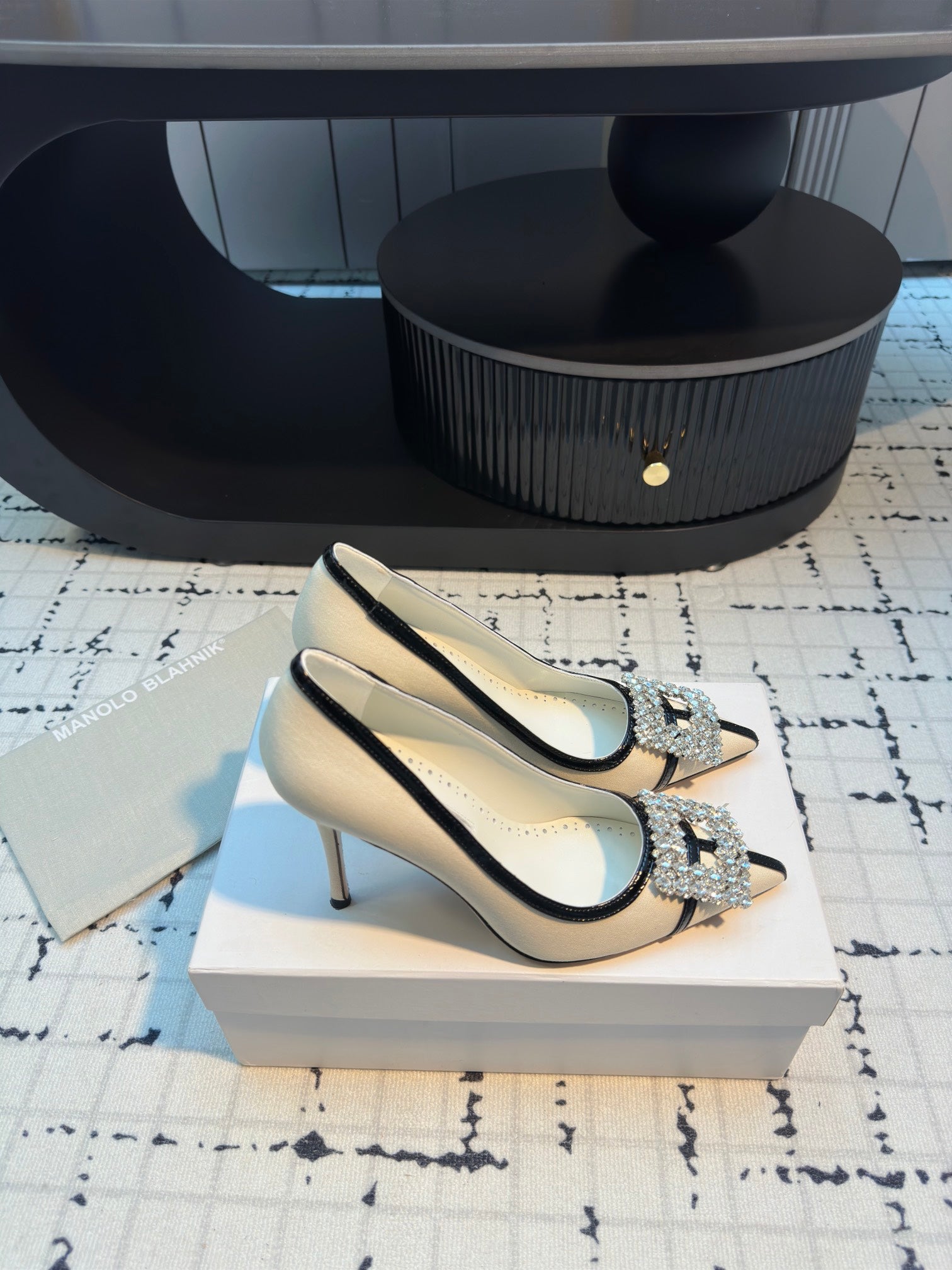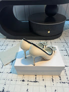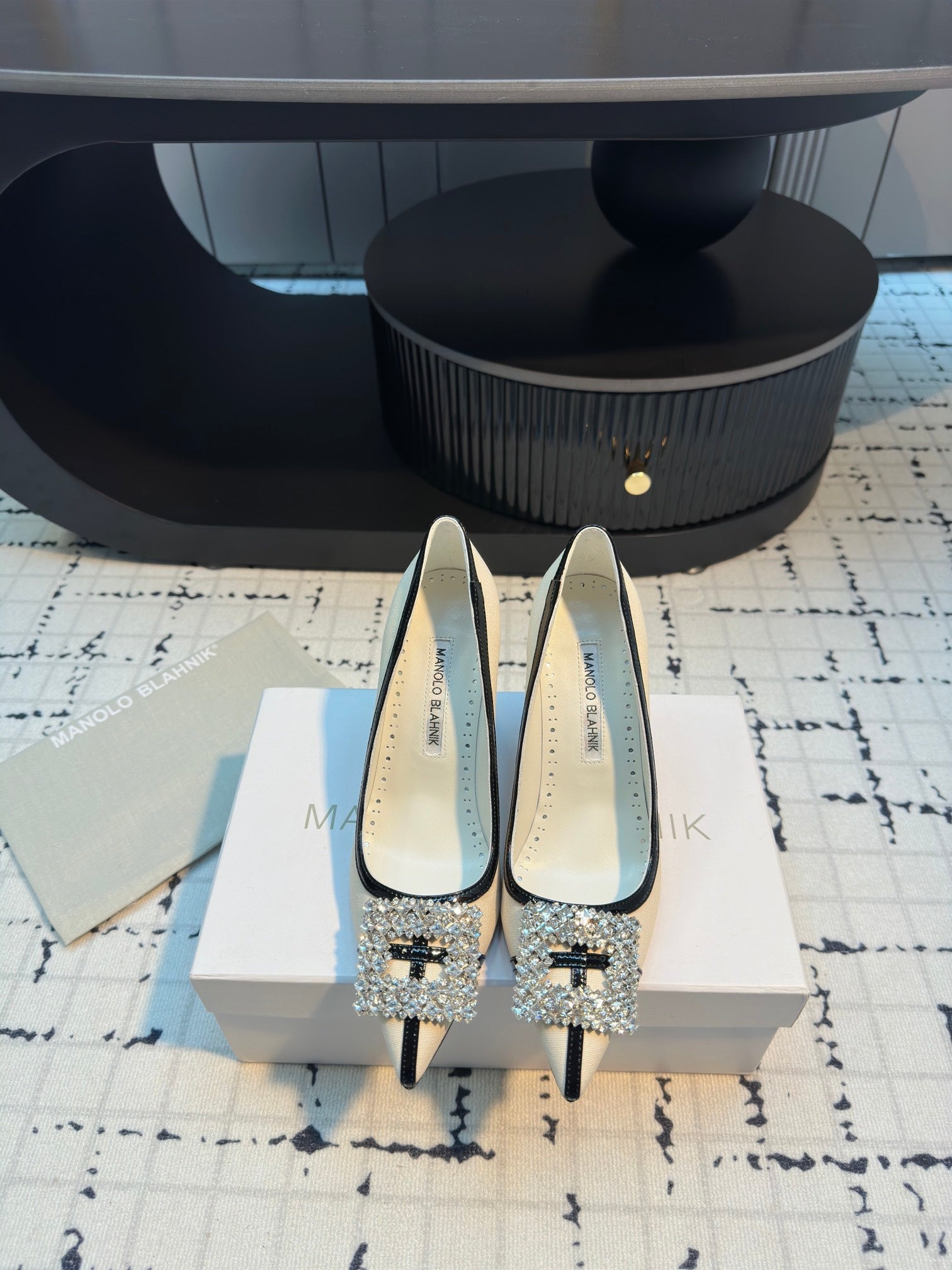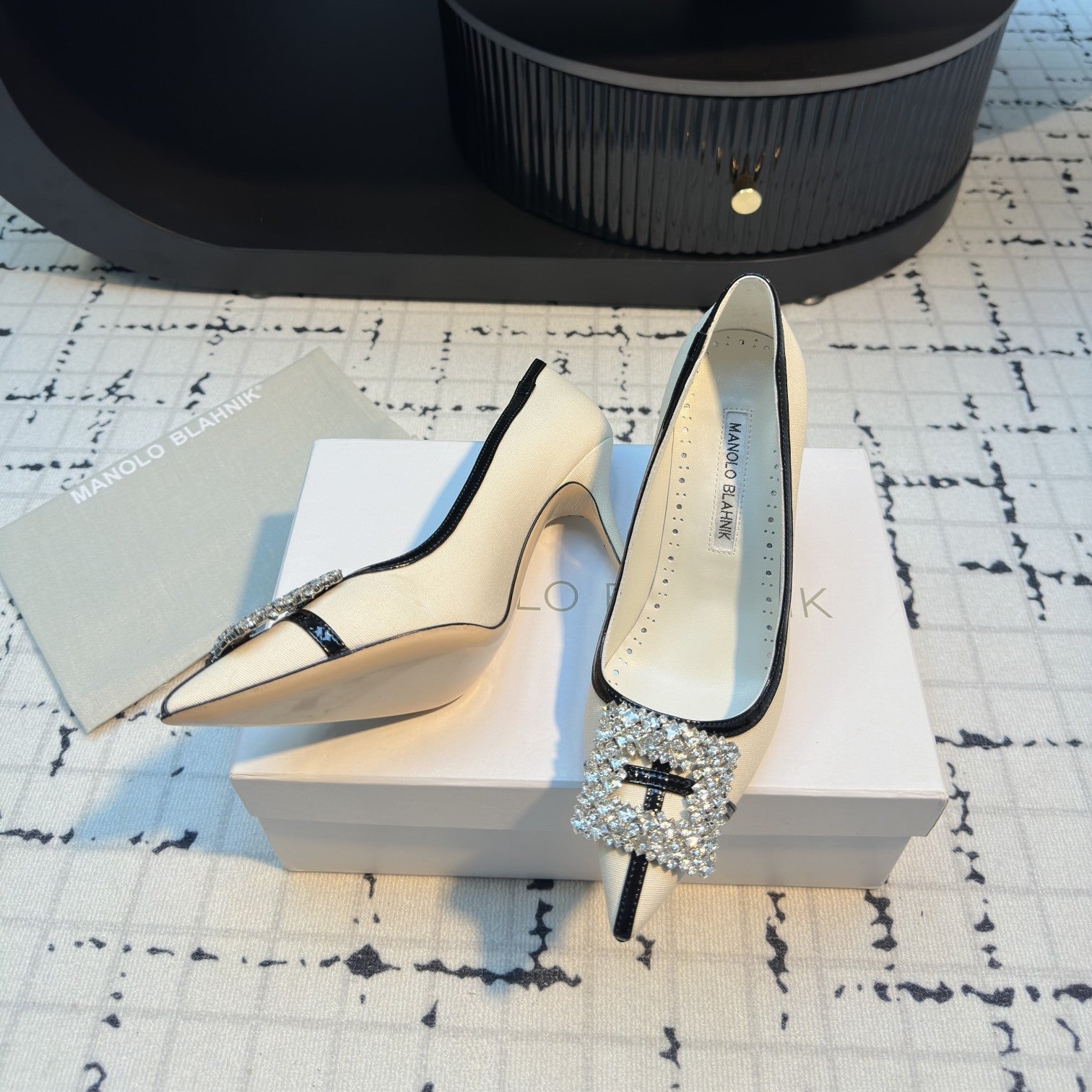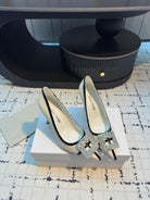 Hangisi 100 Beige Linen with Black Leather Jewel Buckle Pumps 161069