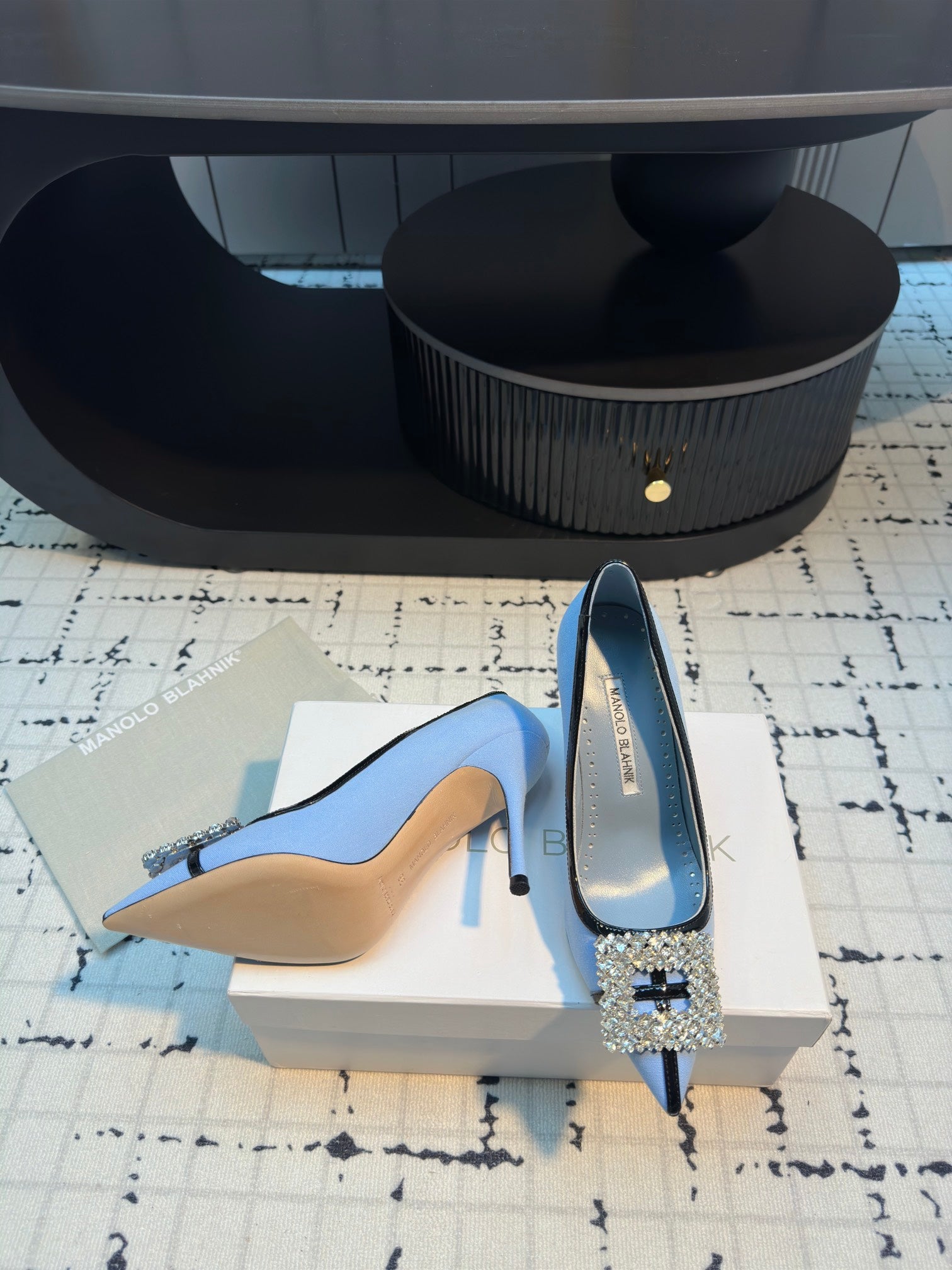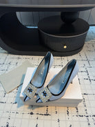 Hangisi 100 Ocean Blue Linen with Black Leather Jewel Buckle Pumps 161068