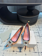 Hangisi 100 Pink Linen with Black Leather Jewel Buckle Pumps 161071