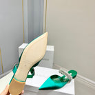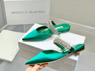 Manolo Flats Mules Diamond Buckle Green Silk Satin 327484