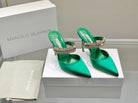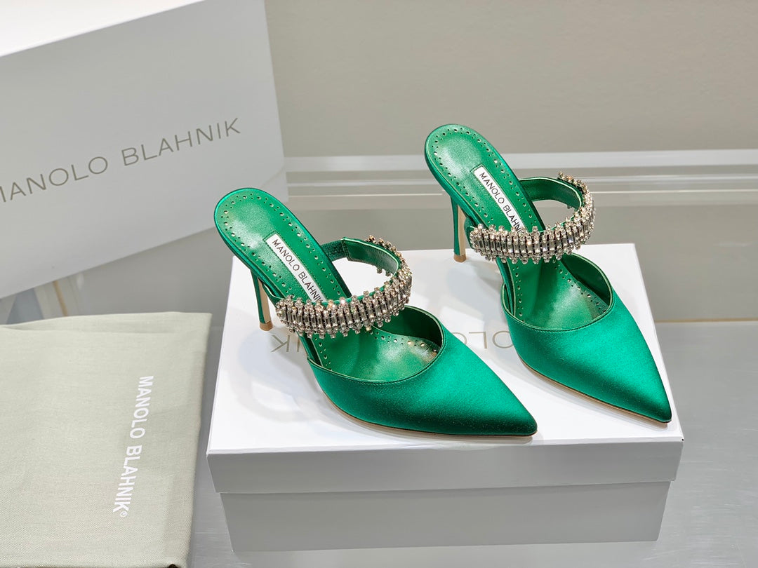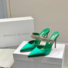 Manolo Mules Diamond Buckle Green Silk Satin 218813