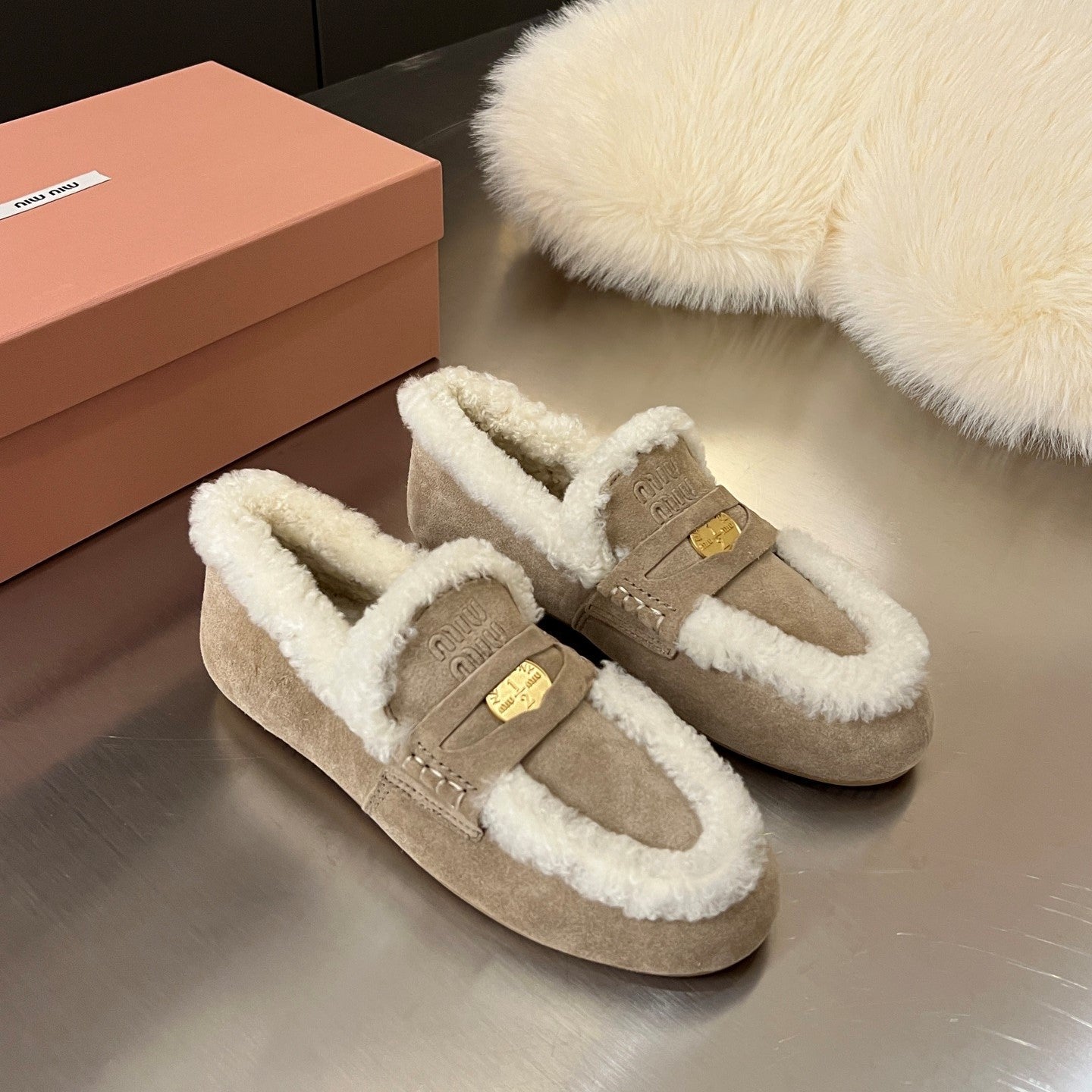 Miu Logo-Embossed Loafer Taupe Suede Shearling 455917