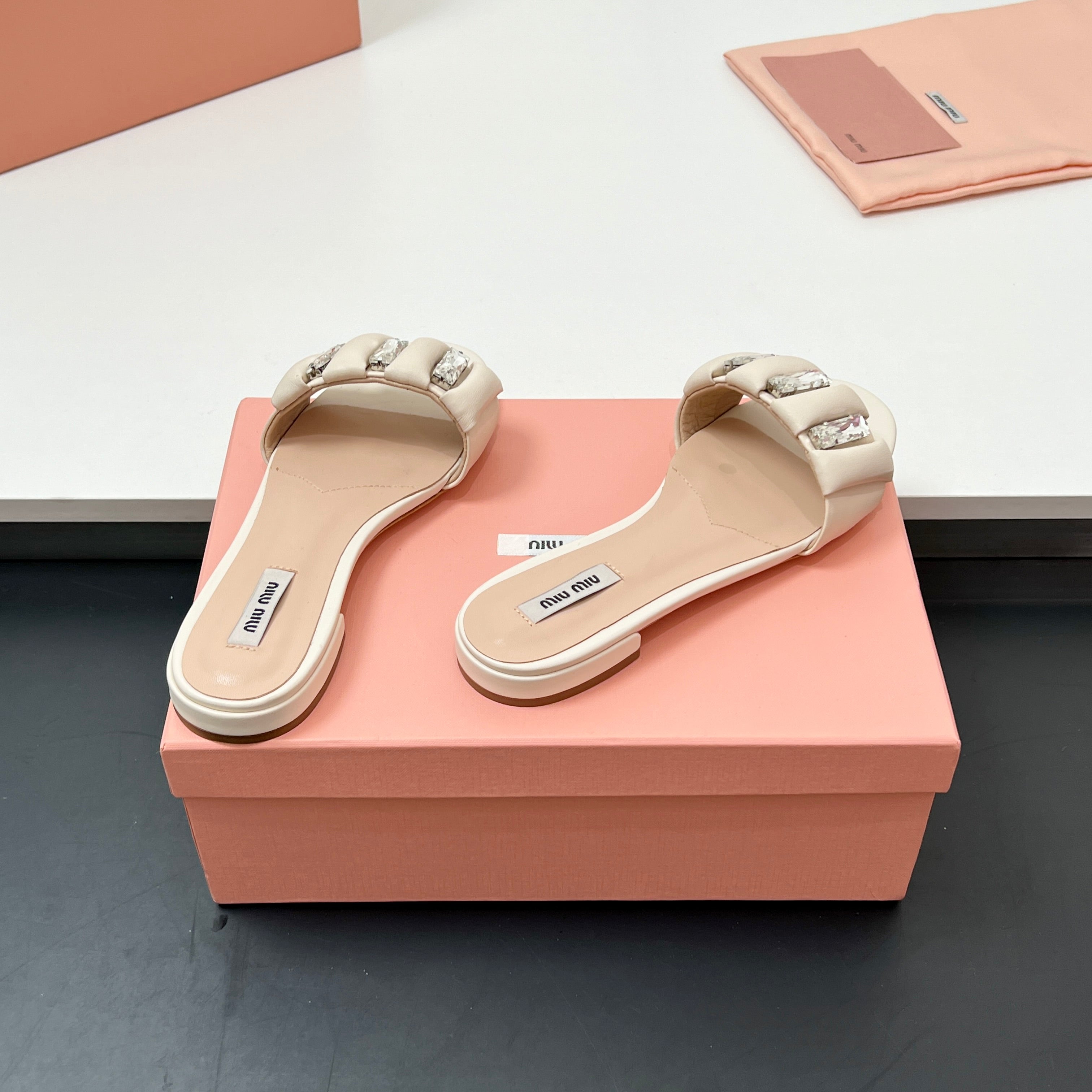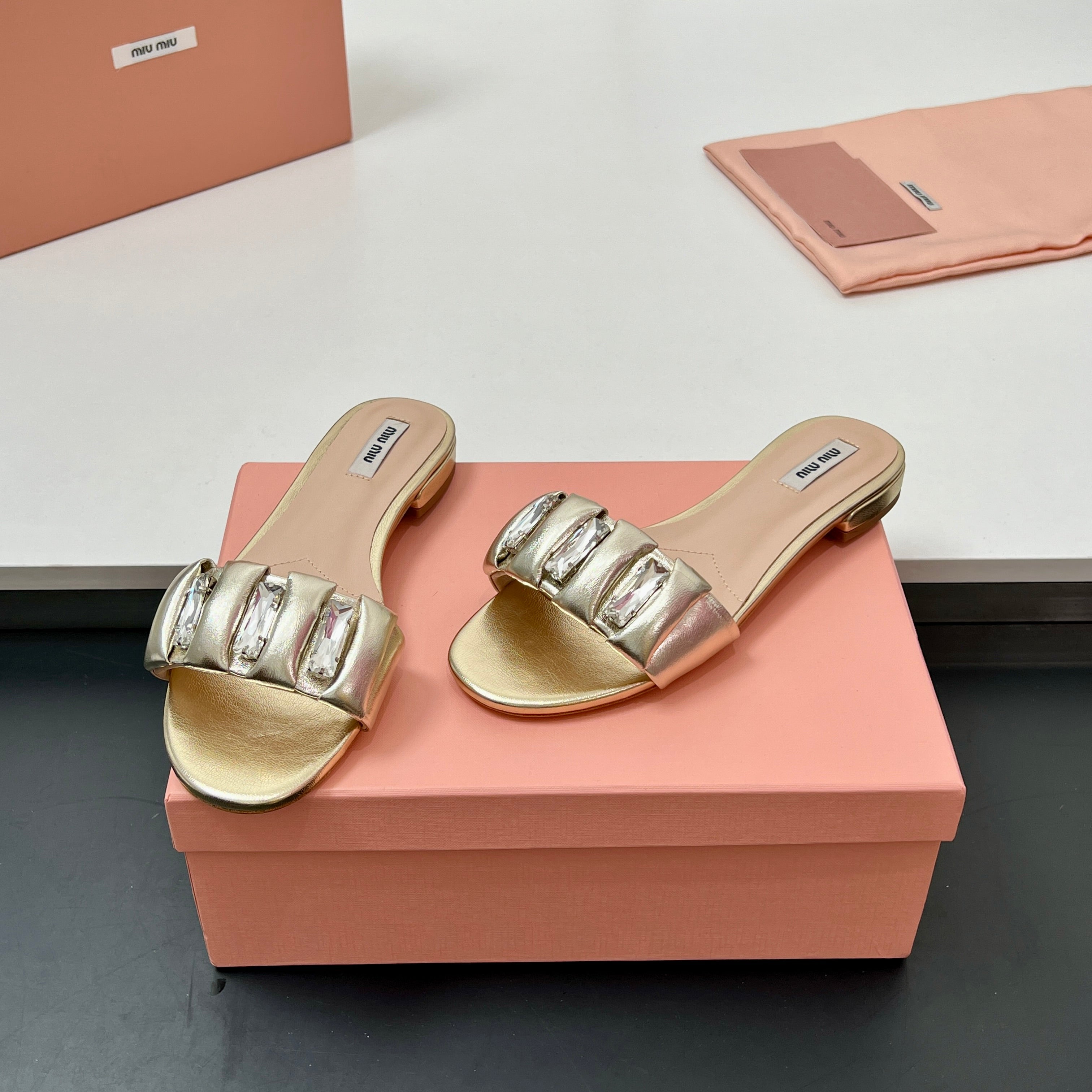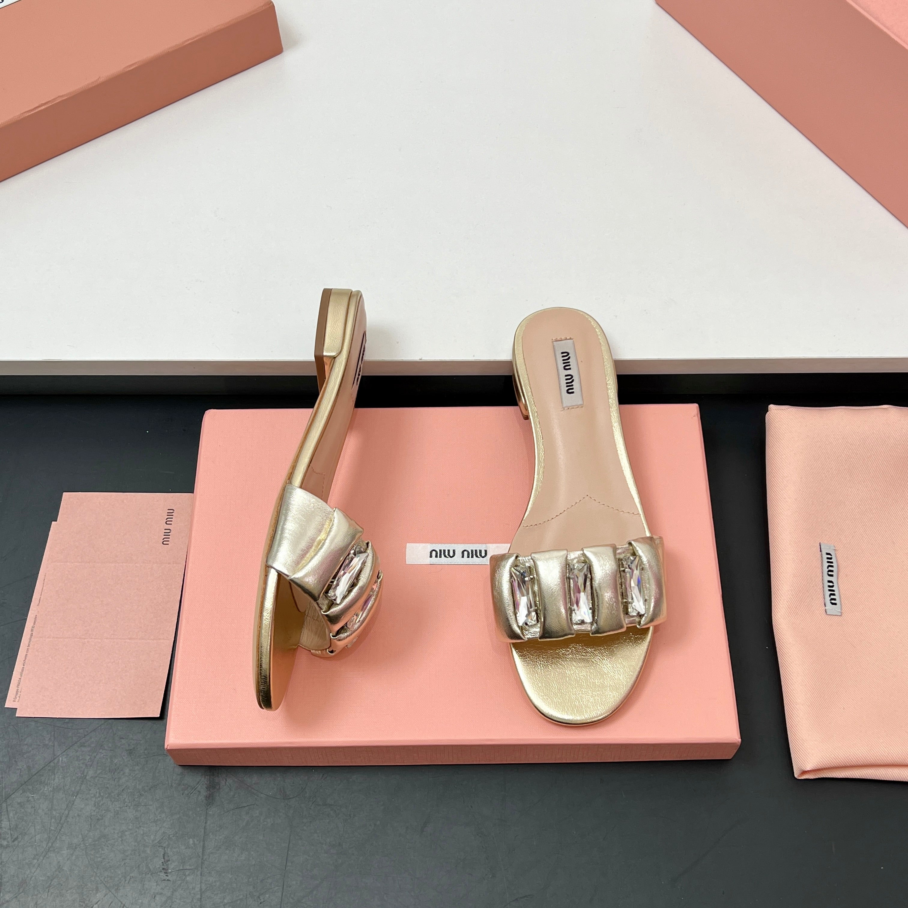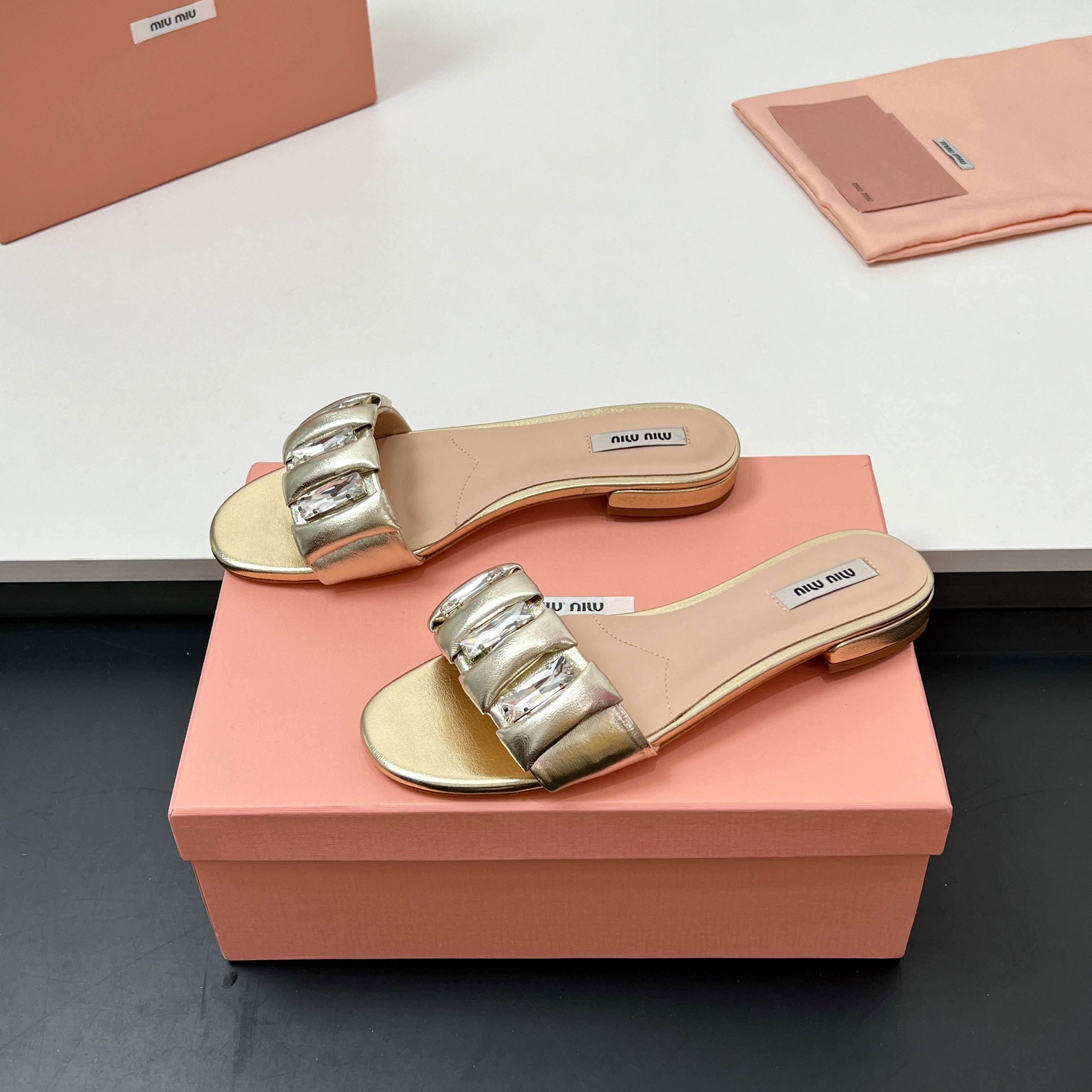 Miu 25S Beige and Gold Canvas and leather slides 678740