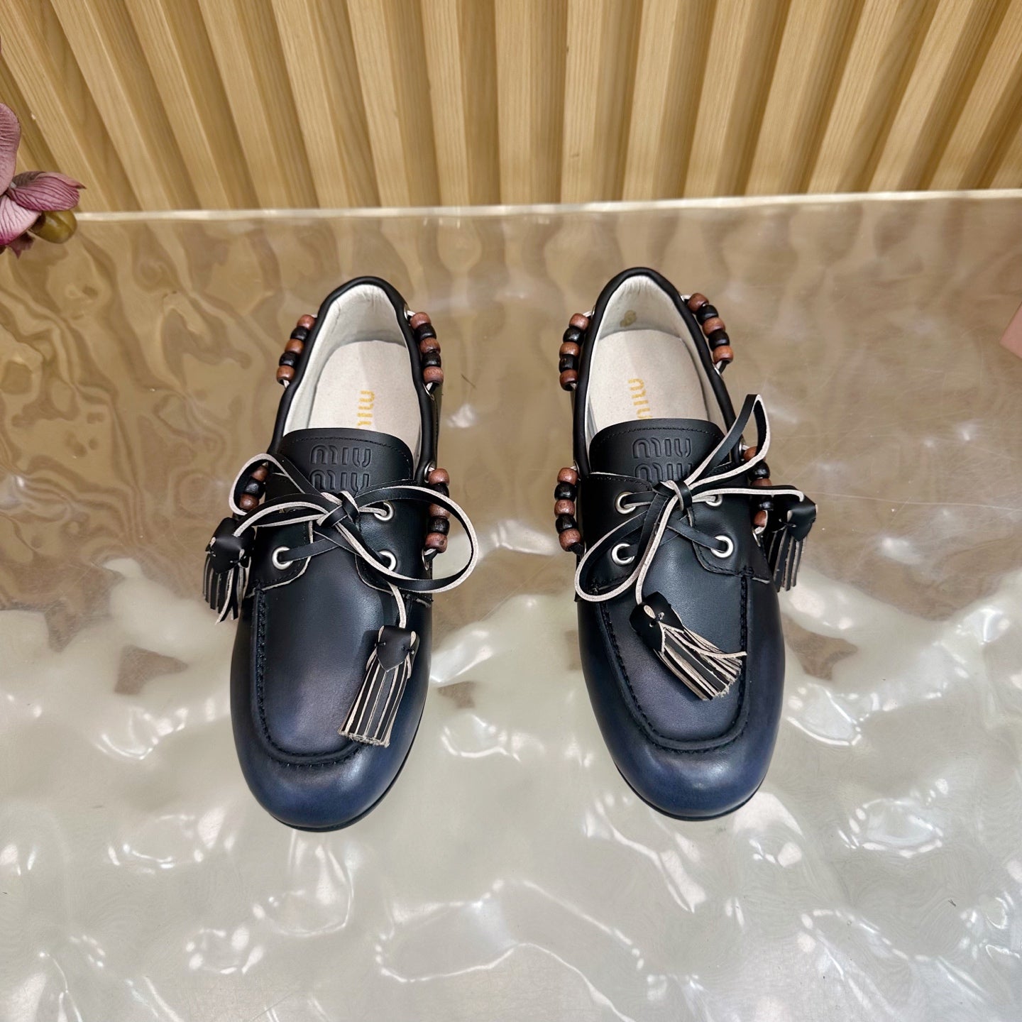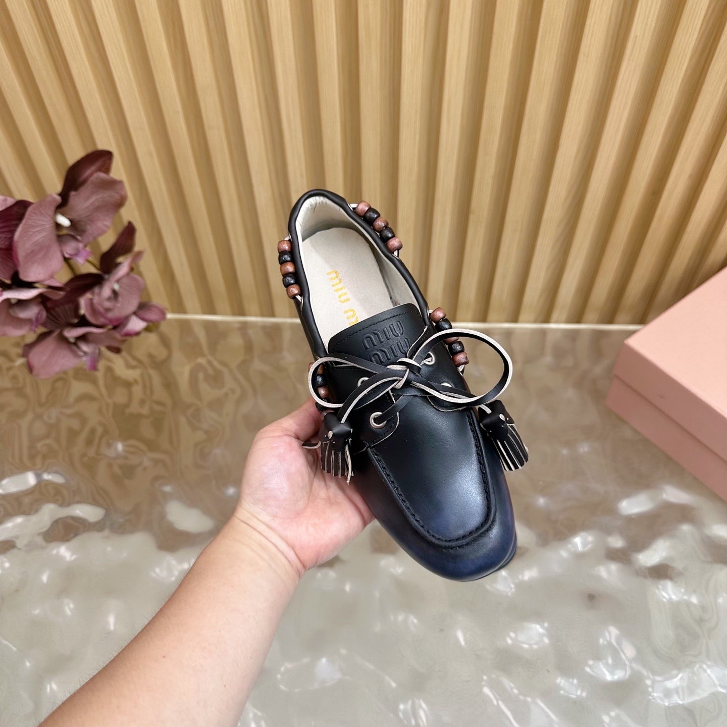 Miu Laces Eyelet Flat Loafer Black Sheepskin 498170