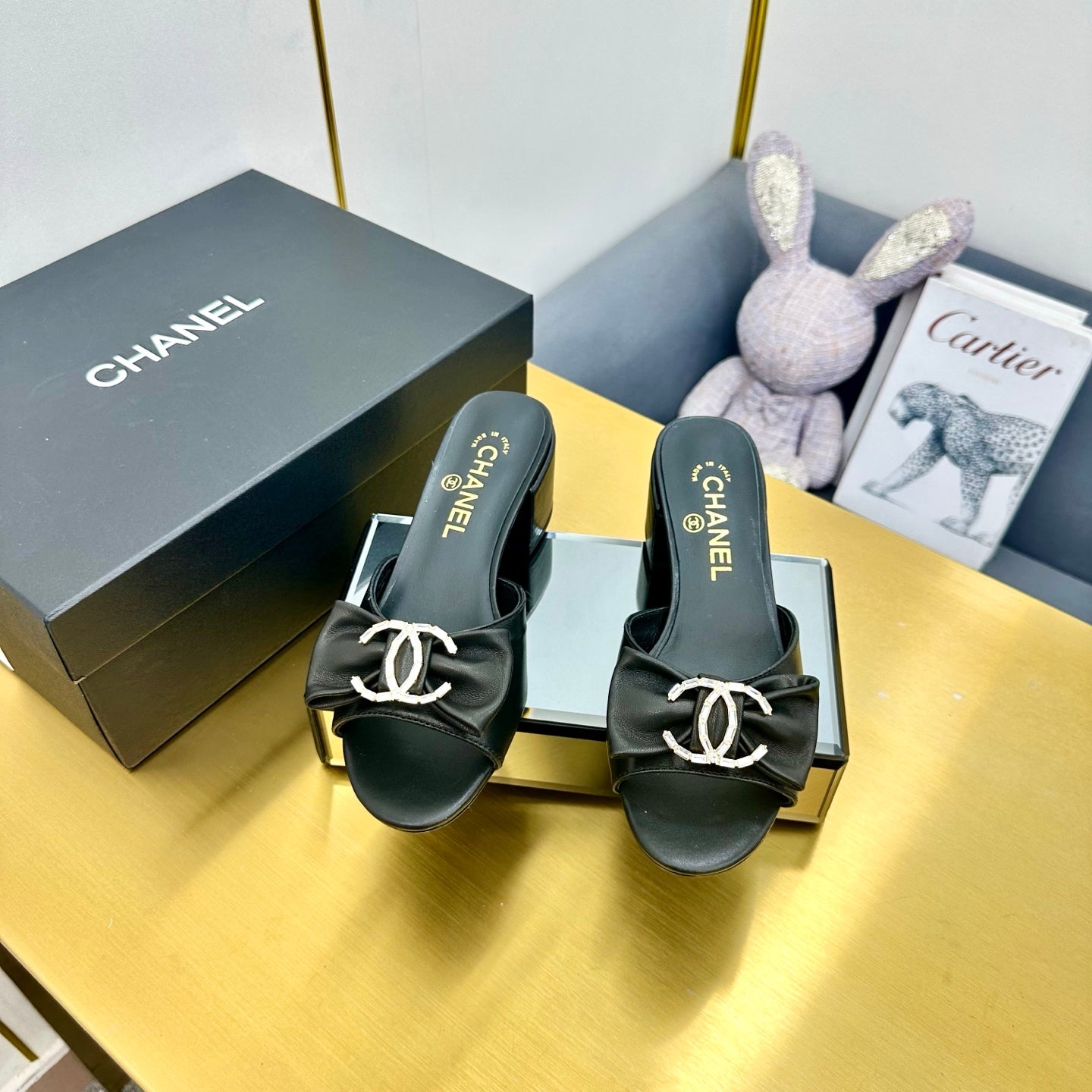 cc 25 bow mule sandal 50mm black sheepskin 238478