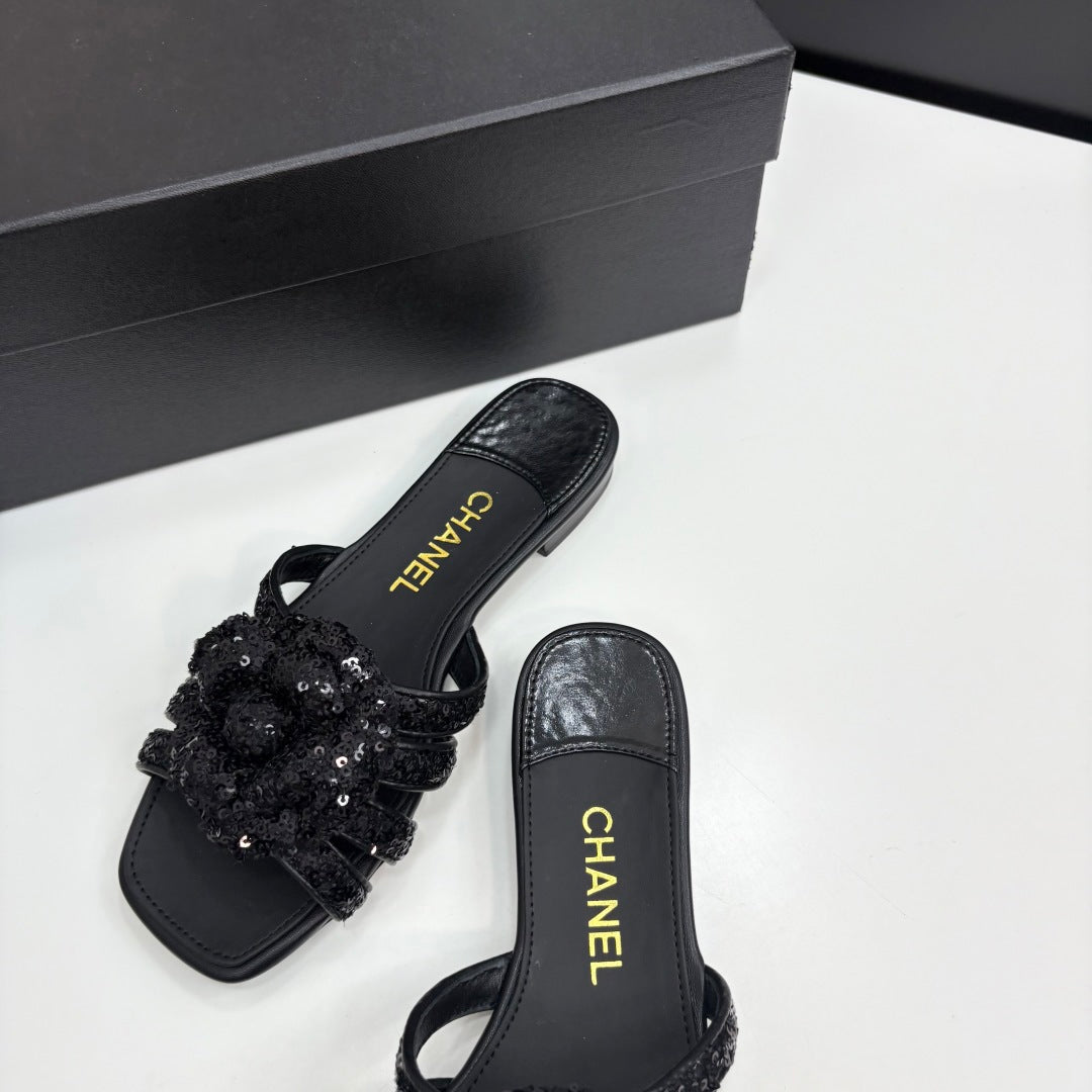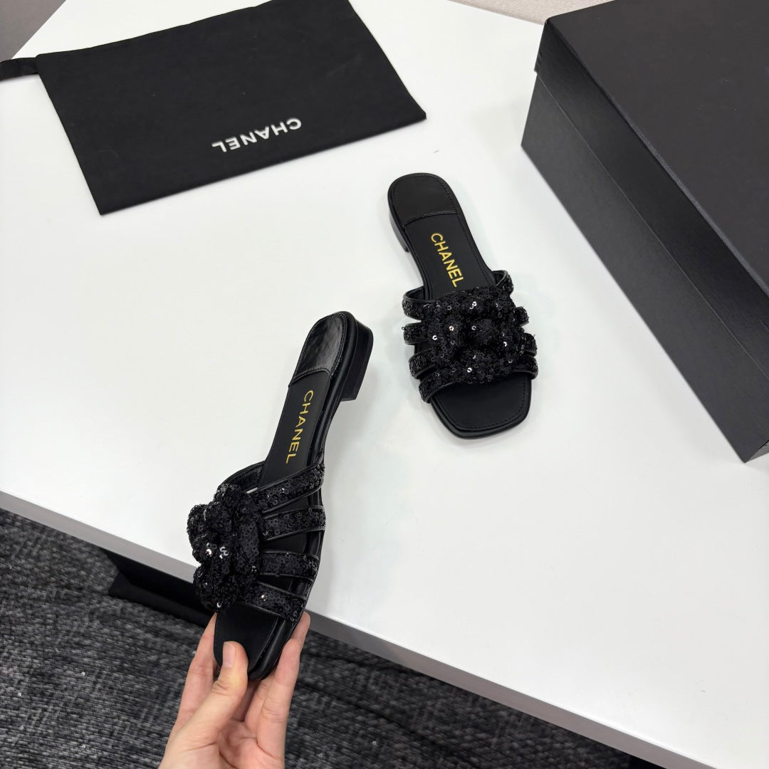 CC 25 Camellia Open Flat Mule Black Coarse Glitter Fabric And Sheepskin 368853