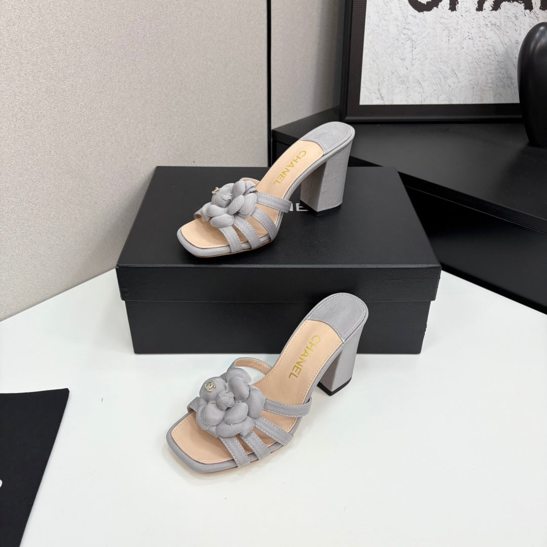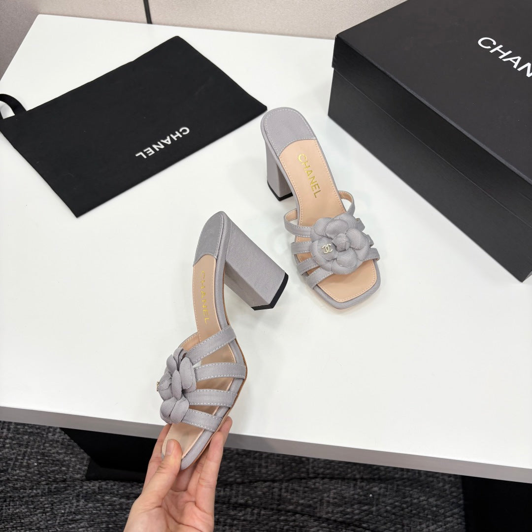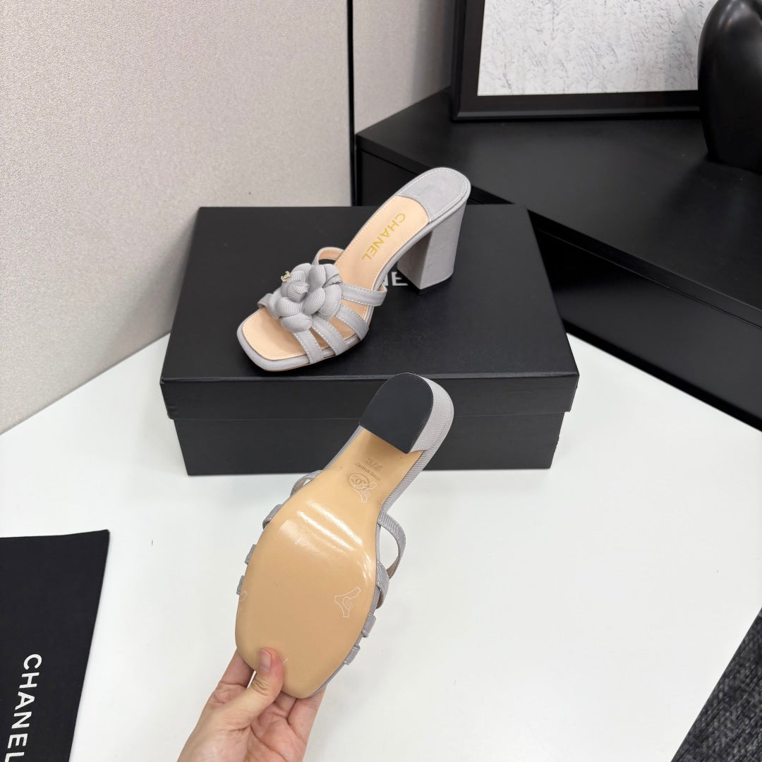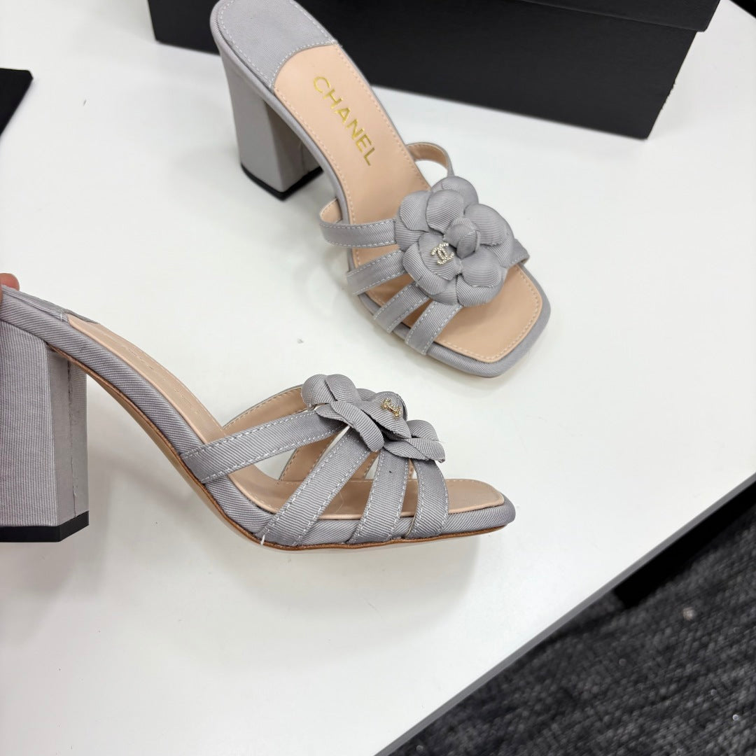 CC 25 Camellia Open Heel Mule Sandals 90mm Grey Beige Sheepskin And Fabric 368842