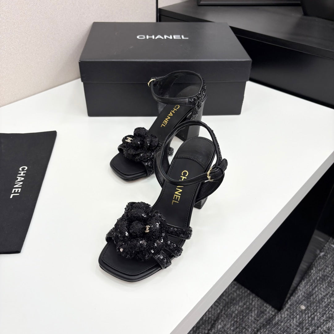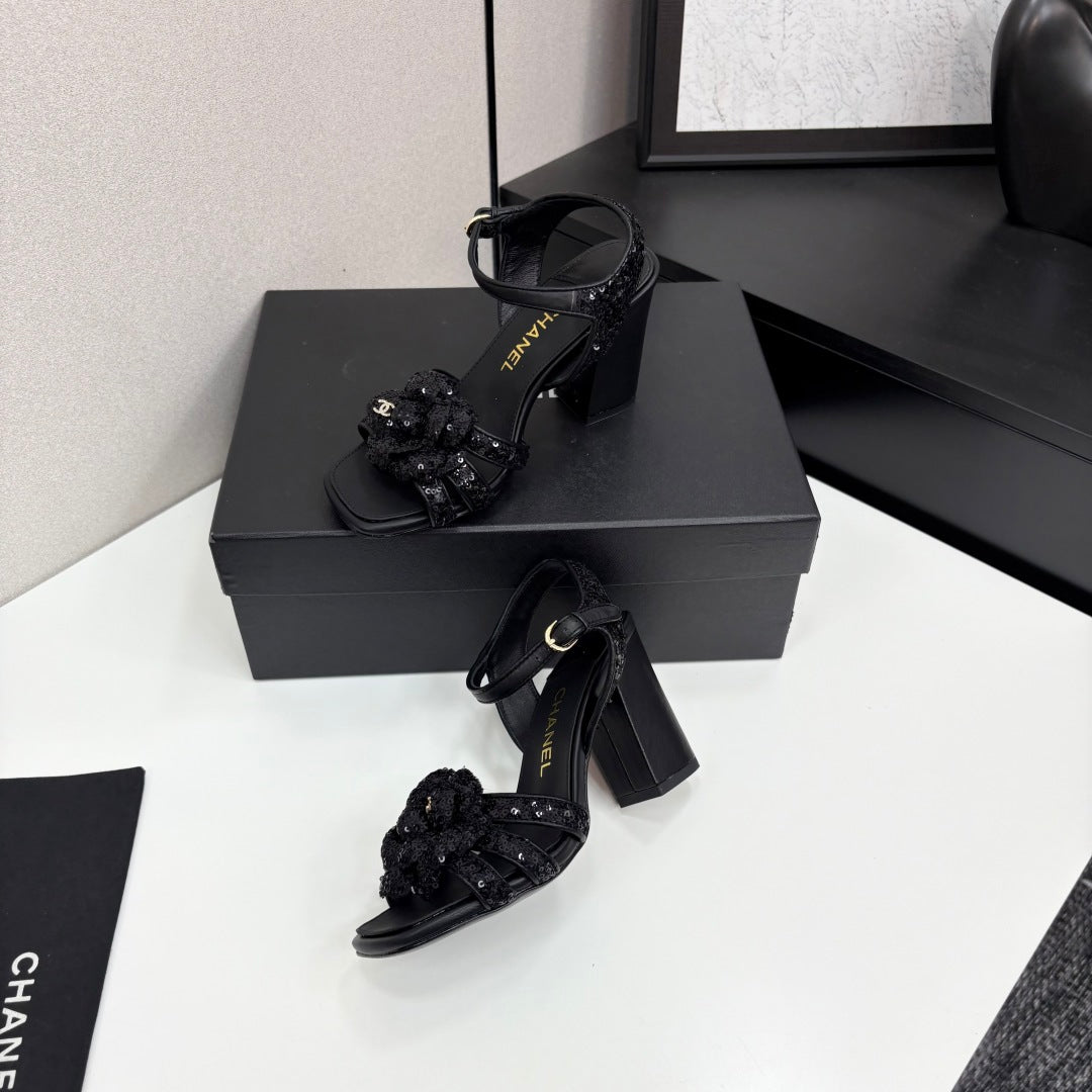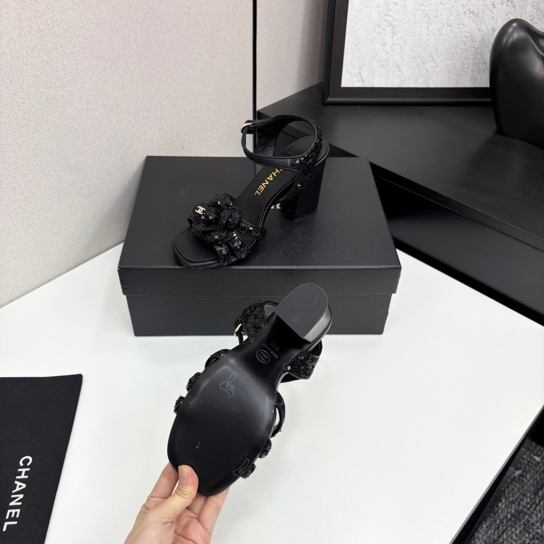 CC 25 Camellia Open Heel Sandals 90mm Black Coarse Glitter Fabric And Sheepskin 368818
